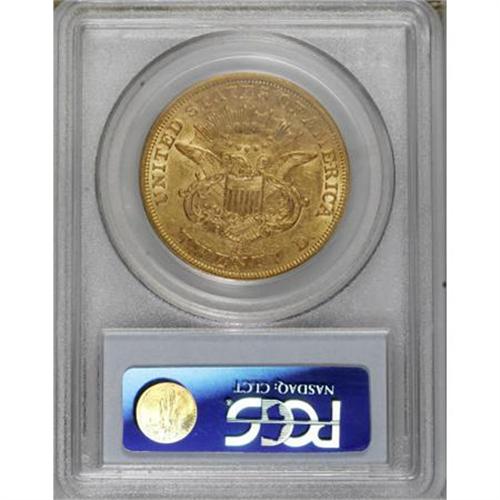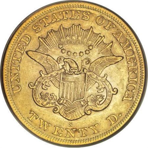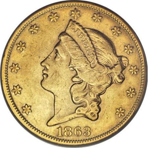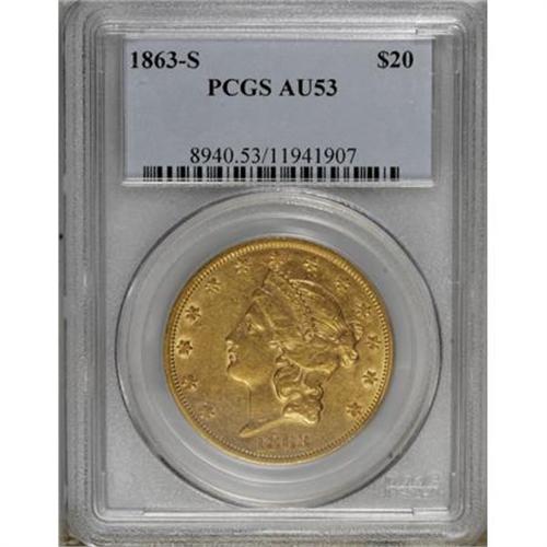 <B>1863-S $20 AU53 PCGS.</B></I> Luster is plentiful across the reverse, and it fills Liberty's hair and individually outlines obverse stars. Marks are minimal, and are fewer than expected for a double eagle that briefly entered commerce. A scarce issue despite the recovery of a small hoard from the <I>S.S. Brother Jonathan</B></I>.<BR><BR><B>Coin Engraver:</B> James B. Longacre<BR><BR><b>Shipping:</b> Coins & Currency (<a target="_blank" href="http://www.heritageauctions.com/common/shipping.php">view shipping information</a>)