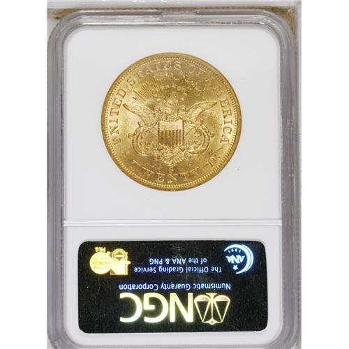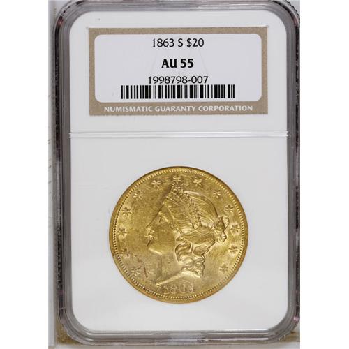 <B>1863-S $20 AU55 NGC.</B></I> Ample luster resides in the recesses of this S-Mint double eagle. The yellow-gold surfaces display nicely struck motifs, and a scattering of minute contact marks.<BR><BR><b>Shipping:</b> Coin/Currency (<a target="_blank" href="http://www.heritageauctions.com/common/shipping.php">view shipping information</a>)