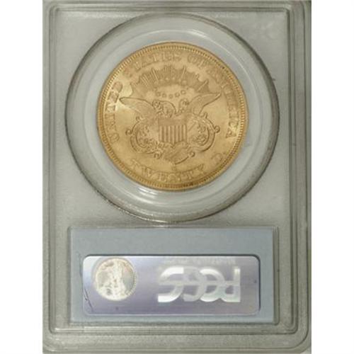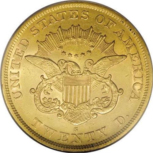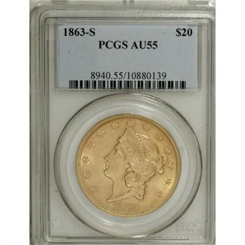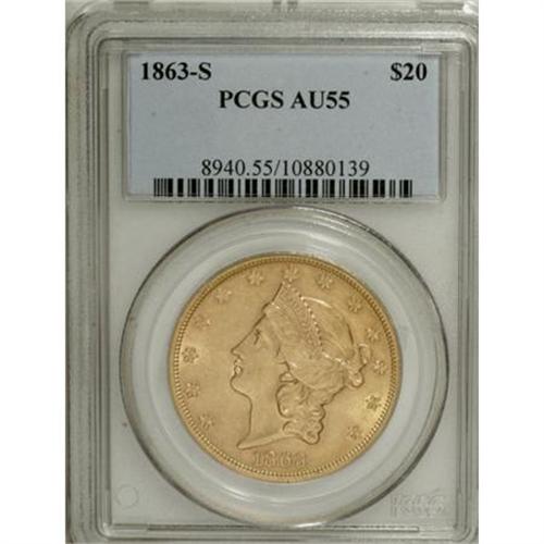 <B>1863-S $20 AU55 PCGS.</B></I> The design elements of this Choice AU survivor are generally bold, except for noticeable flatness on obverse stars 4 through 7, and on selected parts of the eagle. The pale green coloration yields to gleaming coral-gold luster near the devices. Scattered abrasions and traces of highpoint wear on the eagle's wingtips and on Liberty's hair detail define the grade of the piece. <BR><BR><b>Shipping:</b> Coins & Currency (<a target="_blank" href="http://www.heritageauctions.com/common/shipping.php">view shipping information</a>)