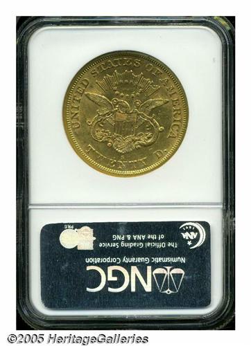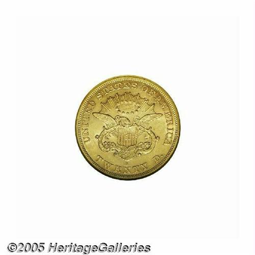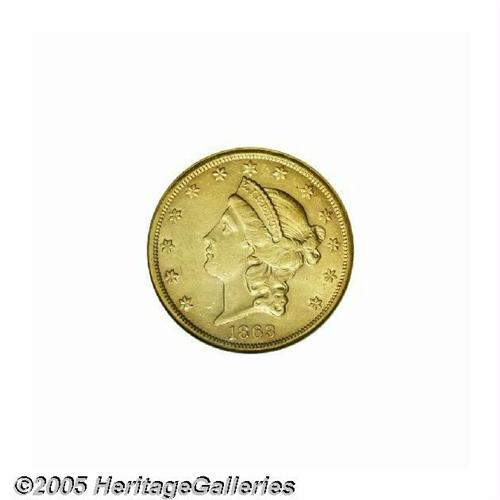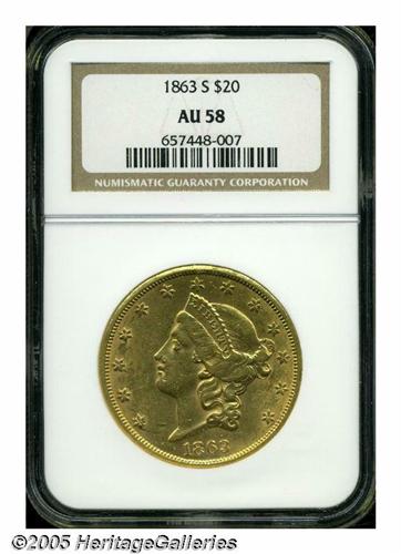 <B>1863-S<$20> AU58 NGC.</B></I> Light yellow-gold with excellent surfaces and good eye appeal. Hints of pinkish gold are reminiscent of those coins recovered from the wreck of the <I>S.S. Brother Jonathan,</B></I> whose treasure was discovered several summers ago. A desirable and popular Type One Double Eagle.