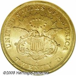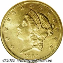<B>1863-S $20 AU58 NGC.</B></I> This is a pleasing example with nearly full luster, broken only by slight wear on the high points of the design. Attractive greenish-gold coloration is accented by wisps of pale pink toning. The surfaces are lightly abraded as expected, including a few minor rim marks on each side.