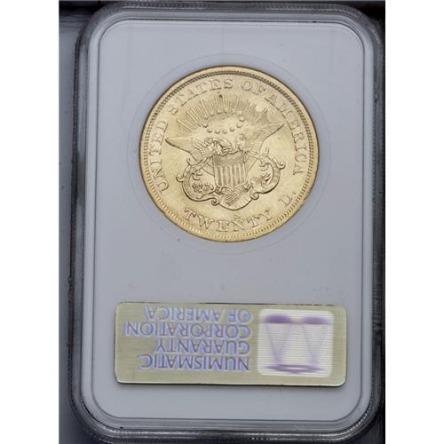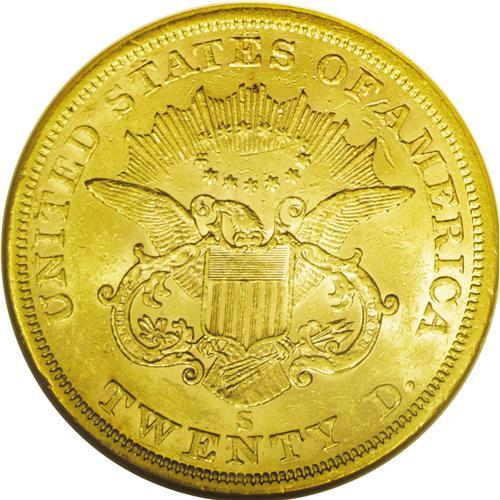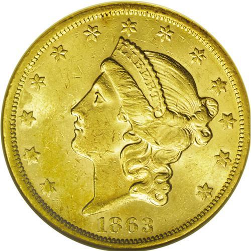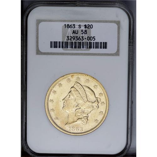 <B>1863-S<$20> AU58 NGC.</B></I> This near-Mint example has the appearance and eye appeal of a full Mint State specimen with its frosty, fulsome luster. The surfaces have scattered abrasions that are expected on these large gold coins, along with a few small surface marks on each side. The light lemon-gold and apricot color variations are quite pleasing to the eye. The strike is somewhat weak on the first three obverse stars, but the other design elements are sharply delineated.<BR> Prior to the discovery of the <I>S.S. Brother Jonathan</B></I> treasure, the 1863-S was one of the scarcest San Francisco issues of its era in high grades. Dave Bowers, who handled the treasure, commented: "The treasure from the <I>S.S. Brother Jonathan</B></I> brought to market a group of AU and Mint State coins, accounting for most of the higher grade pieces known today, although at least a dozen different Mint State coins were on the market in earlier times." The present cataloger, who was also closely involved with the treasure in the late 1990s, has seen every example from that remarkable offering. This specimen has a different look and feel, and was probably not from that treasure, but rather, known in earlier years.<BR><I>From The Wyoming Collection.</B></I>