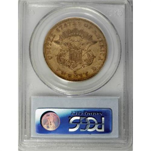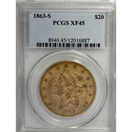 <B>1863-S $20 XF45 PCGS.</B></I> Well struck and luminous with hazy mustard-gold surfaces that show a number of light abrasions and a few more significant marks on the portrait. A small alloy spot is present below star 13.<BR><I>From The York/Hallenbeck #2 Current Finest PCGS Registry Set of Liberty Double Eagles.</B></I><BR><BR><B>Coin Engraver:</B> James B. Longacre<BR><BR><b>Shipping:</b> Coins & Currency (<a target="_blank" href="http://www.heritageauctions.com/common/shipping.php">view shipping information</a>)