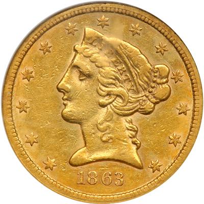 1863-S $5 Liberty. NGC graded AU-50. Only 17,000 minted. Just 5 points shy of the renowned Harry Bass specimen. Current estimates suggest that only 25 to 35 coins survive of this well-known rarity. Traces of gold luster with design details strong in all areas, including on the eagle's legs and claws. Pleasing surfaces with some marks consistent with the grade assigned. The reverse has a short ding in the upper field by D, serving as an ideal pedigree marker (if any useful purpose can be found for a scratch, this might be it).
