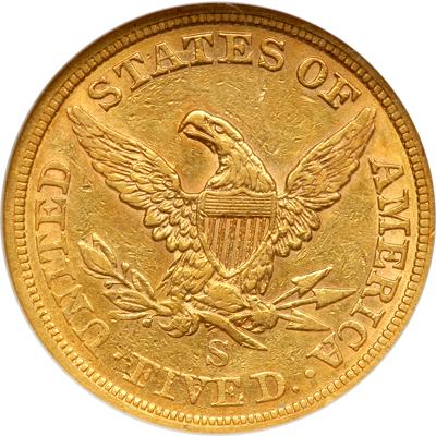 It bears repeating, even though specialists in the series are familiar with the fact, that the 1863-S half eagle is very rare in any condition. Auction data do not lie: most specimens that have appeared on the auction market were in Fine to Very Fine range. Some put this at least as rare as the 1863-P and actually rarer in high grade. It is comparable to the 1858-S and 1860-S in overall rarity and is equally impossible to obtain in choice condition. A "last chance" opportunity for the devoted Half Eagle date collector! Pop 2; 3 in AU53; 3 in AU55; 22 in AU58. (PCGS # 8295).