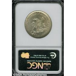<B>1863-S 50C MS63 NGC.</B></I> WB-102. "Broken" Mintmark. The mintmark was formed from a defective punch with the top curve of the S broken away. Well struck with bright, lightly marked surfaces that have a pleasing satiny sheen. Faint clash marks (as struck) are evident in the fields, on obverse and reverse alike. Population: 9 in 63, 13 finer (2/05).