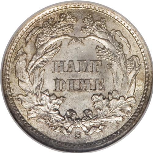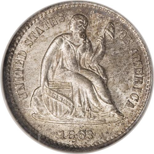 <B>1863-S H10C MS66 NGC.</B></I> This piece ranks among the finer existing examples of the date. During the middle of the Civil War, silver production in Philadelphia was limited, and those pieces coined did not circulate. In San Francisco, mintages were generally higher, but most of the coins immediately entered circulation and Gem or finer quality examples survived in extremely limited quantities. This sharply struck piece has exquisite detail and frosty luster. The obverse exhibits considerable gold toning and the reverse is mostly brilliant. Census: 2 in 66, 1 finer (4/07).<BR><BR><b>Shipping:</b> Coins & Currency (<a target="_blank" href="http://www.heritageauctions.com/common/shipping.php">view shipping information</a>)
