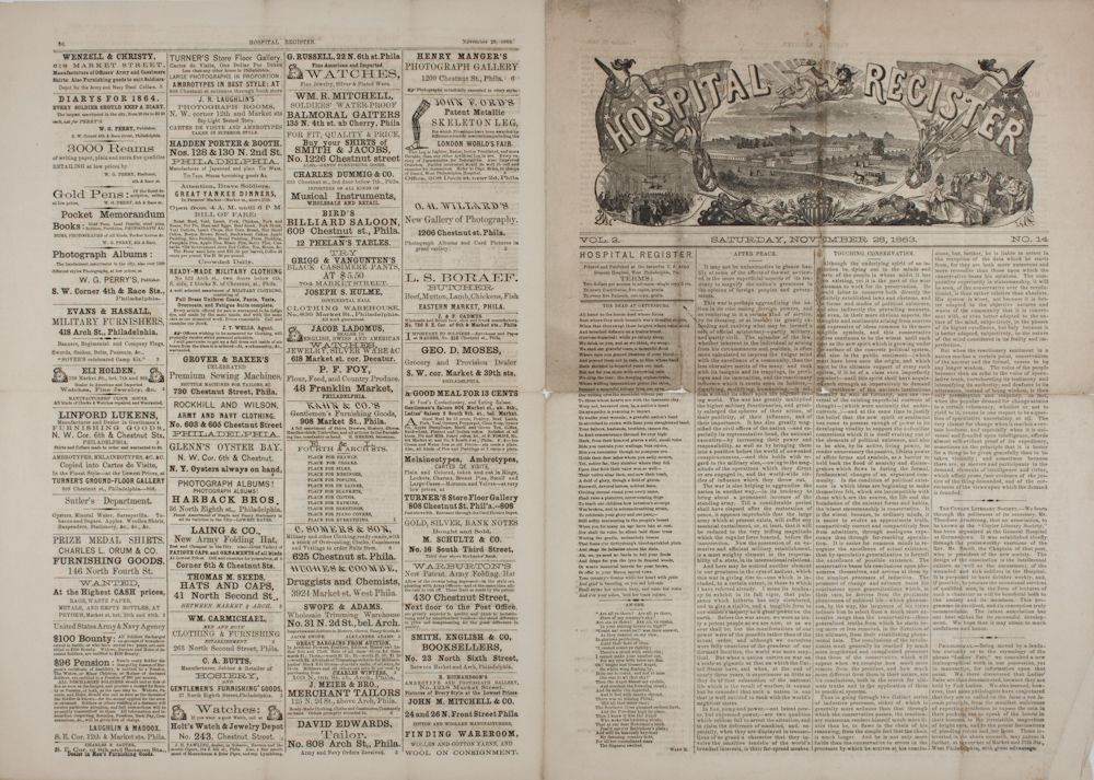 A good war-date Union hospital newspaper, 4pp. large folio, entitled: "HOSPITAL REGISTER," published at the Satterlee Hospital, West Philadelphia, Pa., Nov. 28, 1863 being Vol. 2 number 14. Appearing in the mast head is finely engraved areal view of Satterlee Hospital and of patients being administered to in their hospital beds. In the front page's first column is a touching tribute poem titled: "The Dead At Gettysburg" while other articles through out the newspaper include "After Peace", "Touching Conservatism", "Affairs in Europe", and "The Hospital School." On the inside of the newspaper is a list of unclaimed soldier letters that are waiting to be picked up at the local post office; then the "Military Directory, Department of the Susquehanna, Headquarters 1125 Girand Street, Maj. Gen. Geo. Cadwalader Commanding." followed by a list of all the medical personnel at the area's US General hospitals including Satterlee, McClellan, Mower, Chester and Turner's Lane to name a few. There is also a list of those admitted to those recently admitted to the hospitals and those who have died. These directories are very informative to researchers of medical matters of the Civil War while an advertisement in the rear of the newspaper illustrates the sale of: "John Ford's Patent Metallic Skeleton Leg." A must-have for those who lost a leg for the Union! Overall very good.