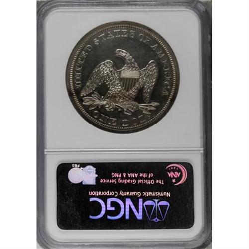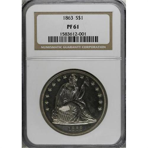 <B>1863 $1 PR61 NGC.</B></I> Delicate gold toning is even save for glimpses of a russet streak on the lower reverse. Well struck and typically hairlined. A popular proof Motto issue, due to its Civil War origin and its tiny mintage of 460 pieces.<BR><BR><B>Coin Engraver:</B> Christian Gobrecht<BR><BR><b>Shipping:</b> Coins & Currency (<a target="_blank" href="http://www.heritageauctions.com/common/shipping.php">view shipping information</a>)