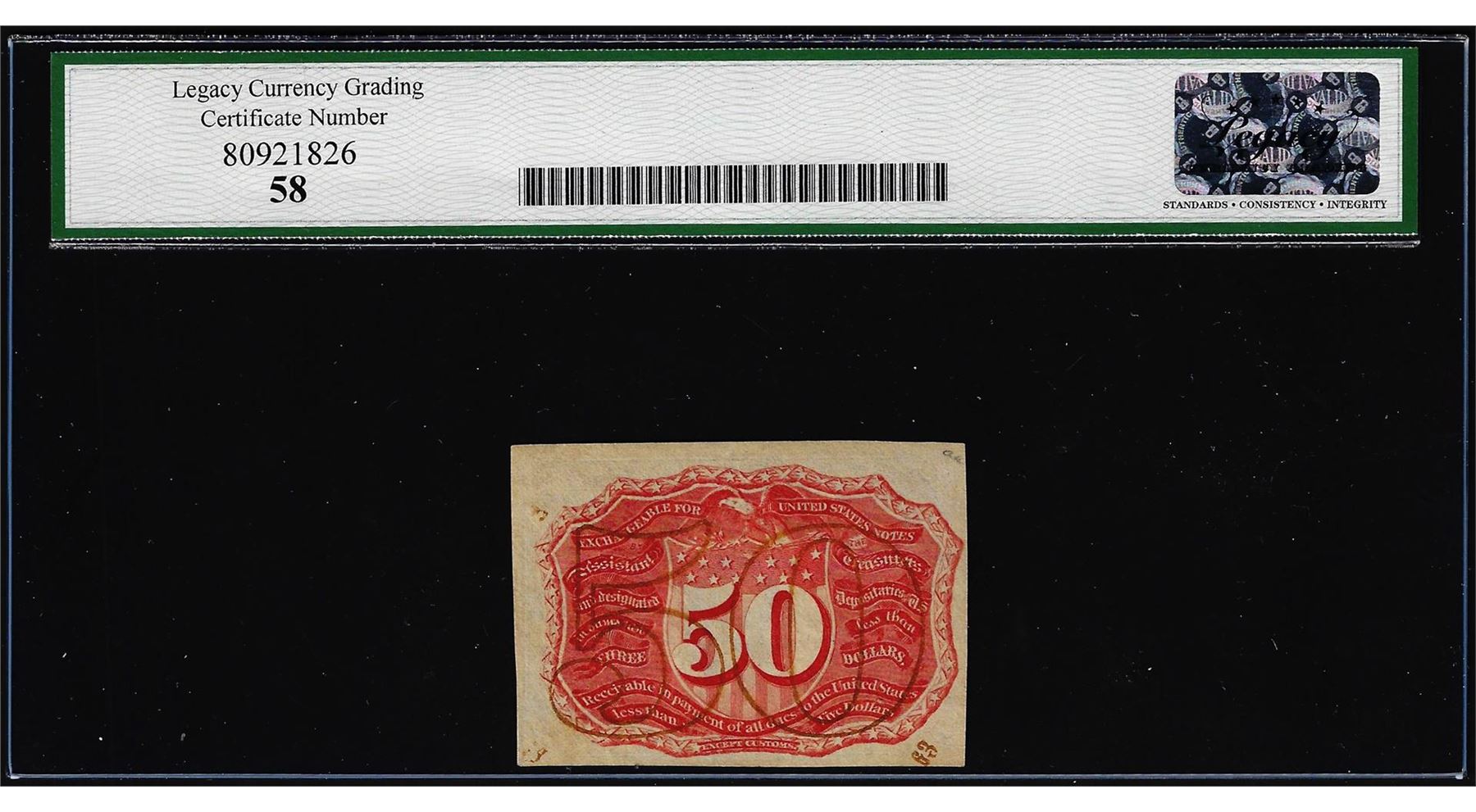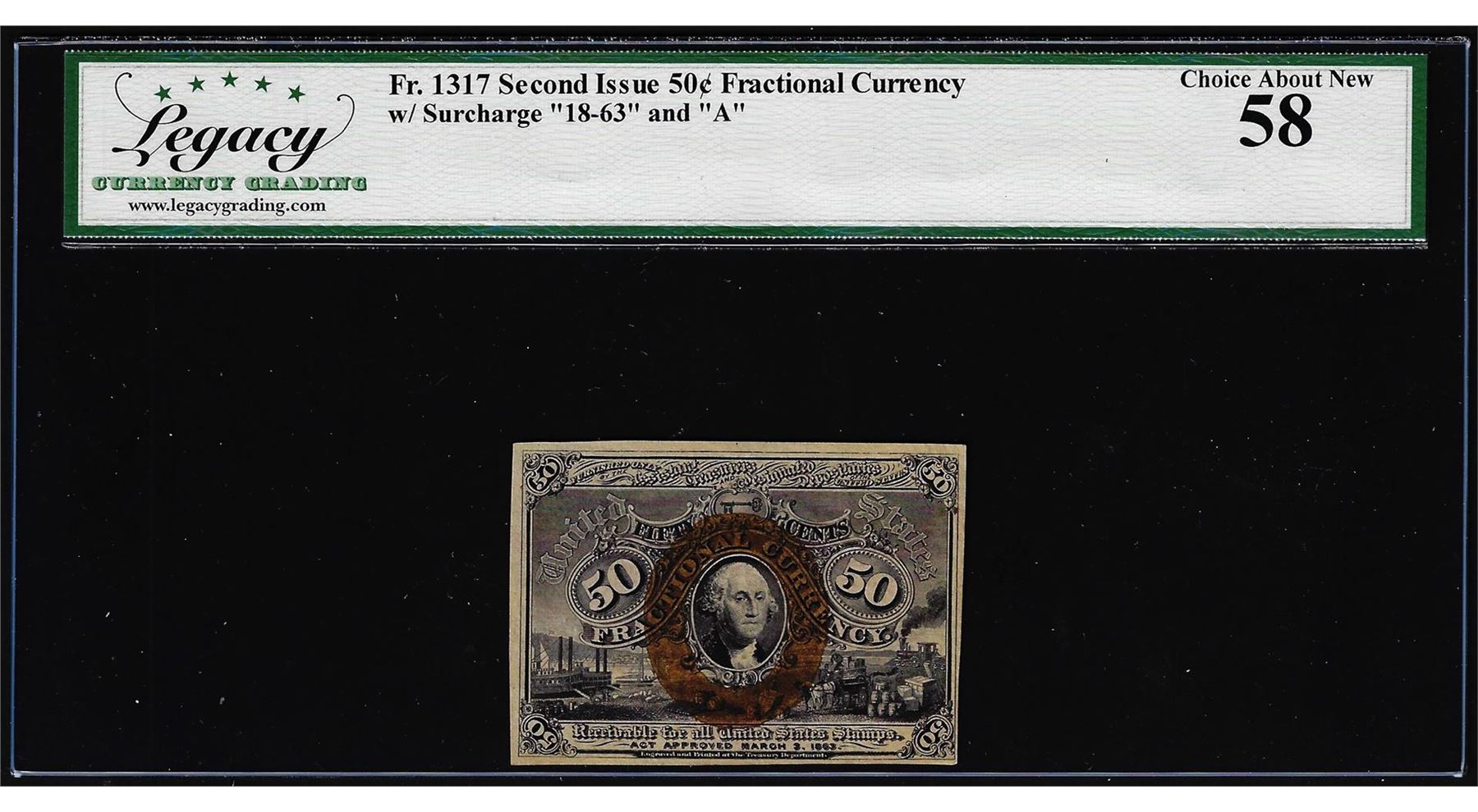 One 1863 Second Issue 50 Cent Fractional Currency Note Fr.1317 Legacy Choice About New 58. Legacy Graded.