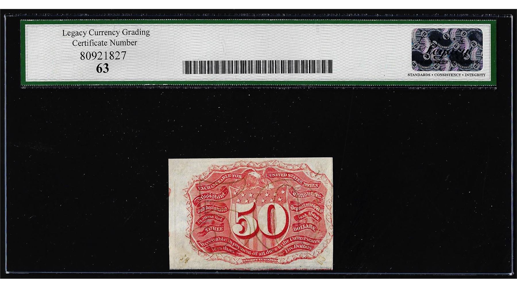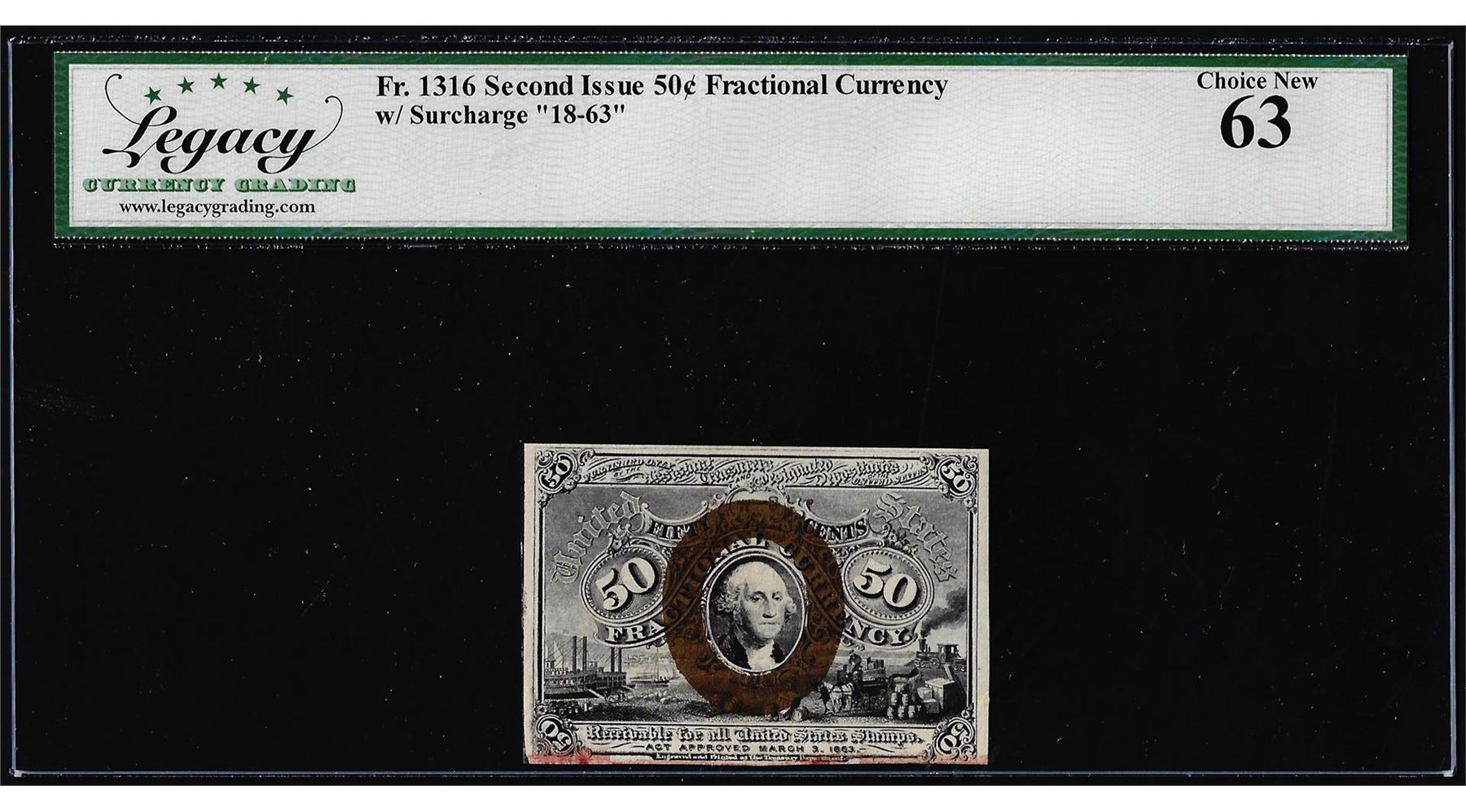 One 1863 Second Issue Fifty Cents Fractional Currency Note Fr.1316 Legacy Choice New 63. Legacy Graded.
