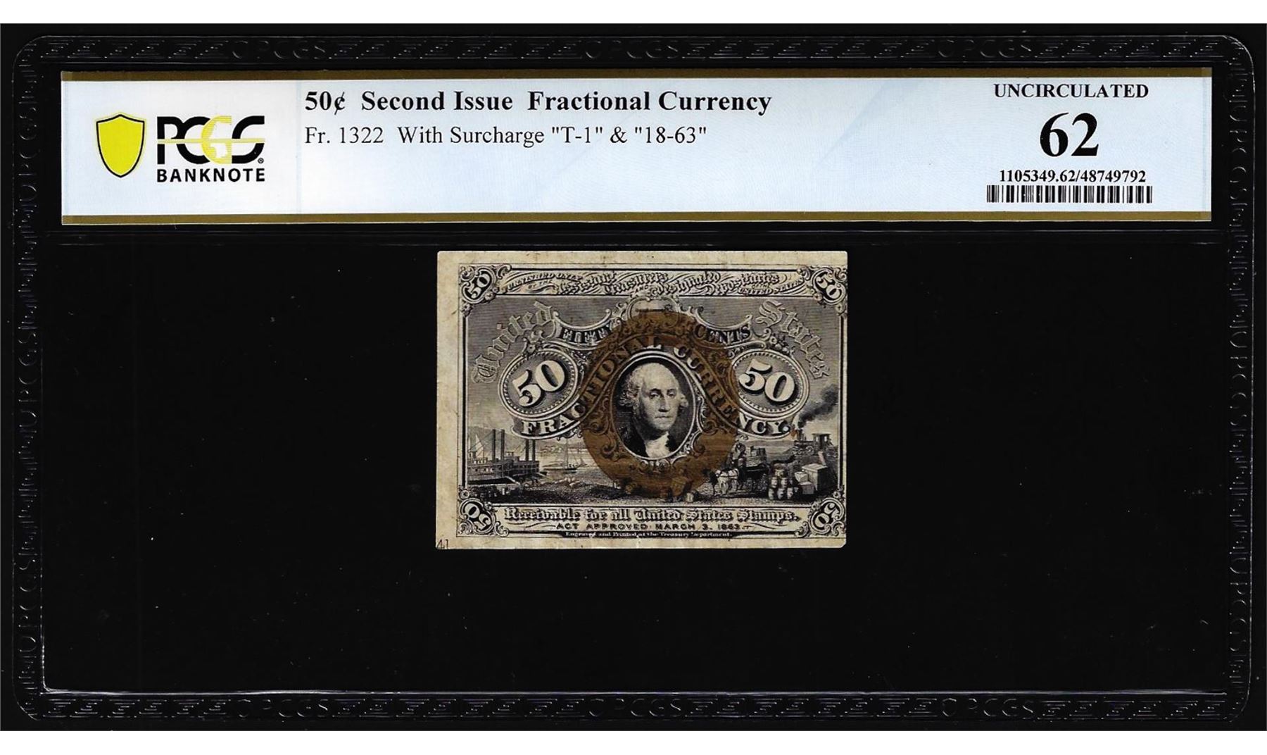 One 1863 Second Issue Fifty Cents Fractional Currency Note Fr.1322 PCGS Uncirculated 62. PCGS Graded.