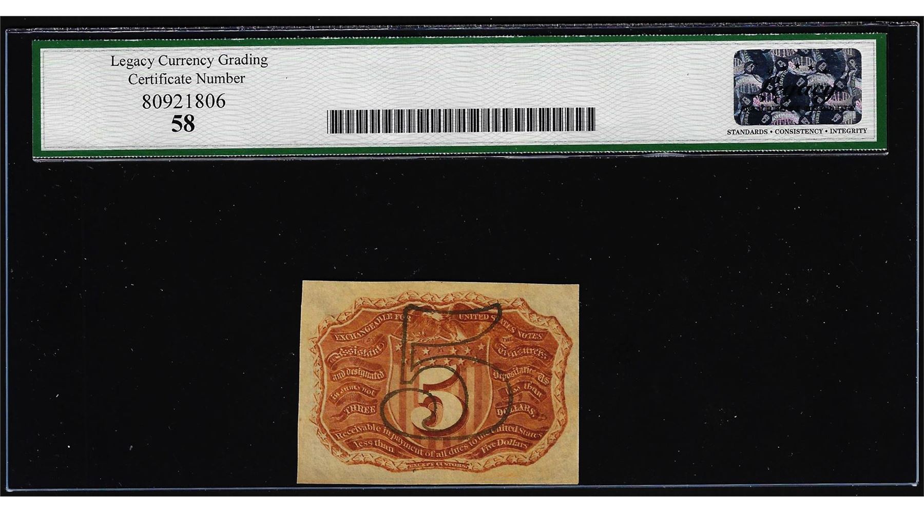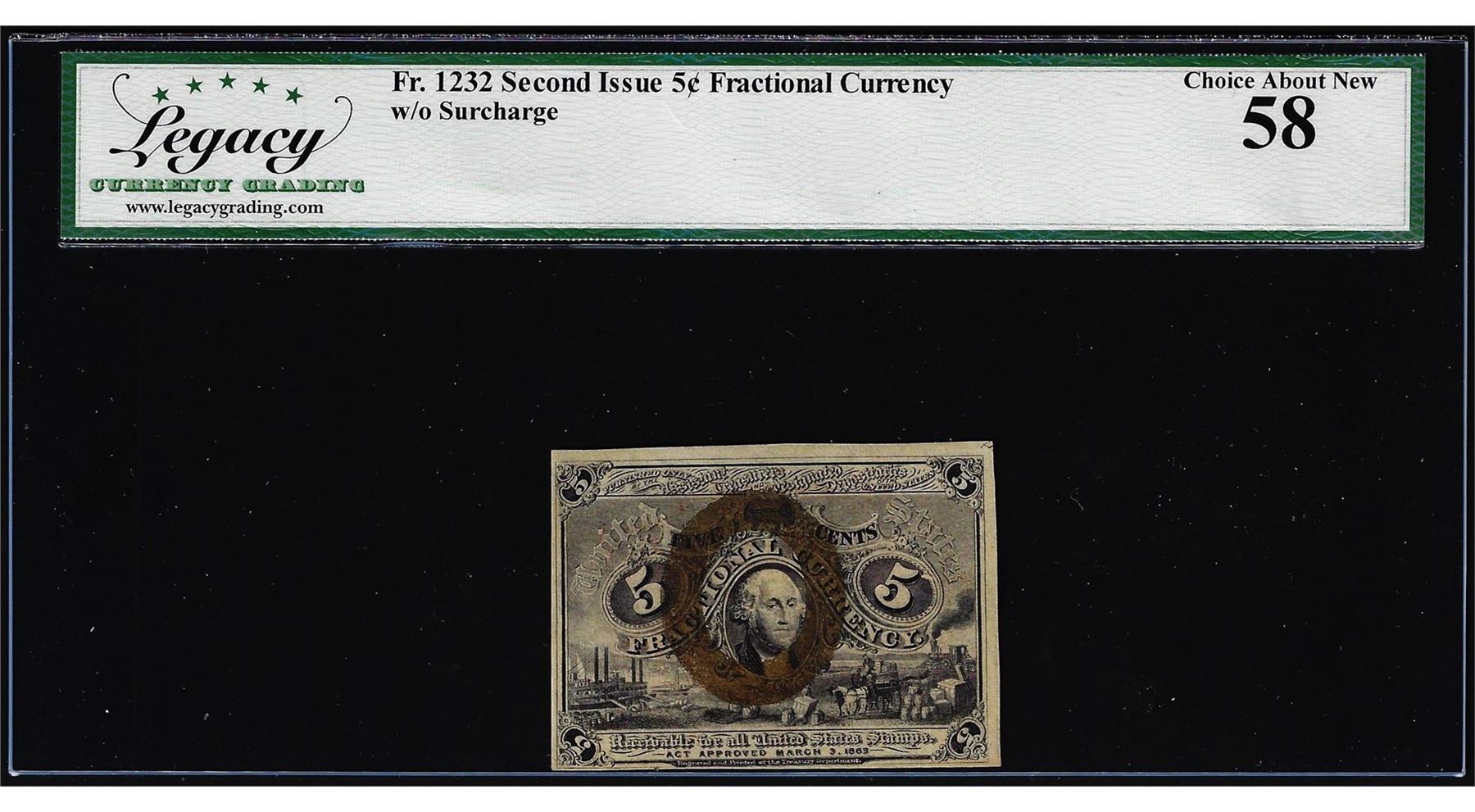 One 1863 Second Issue Five Cents Fractional Note Fr.1232 Legacy Choice About New 58. Legacy Graded.