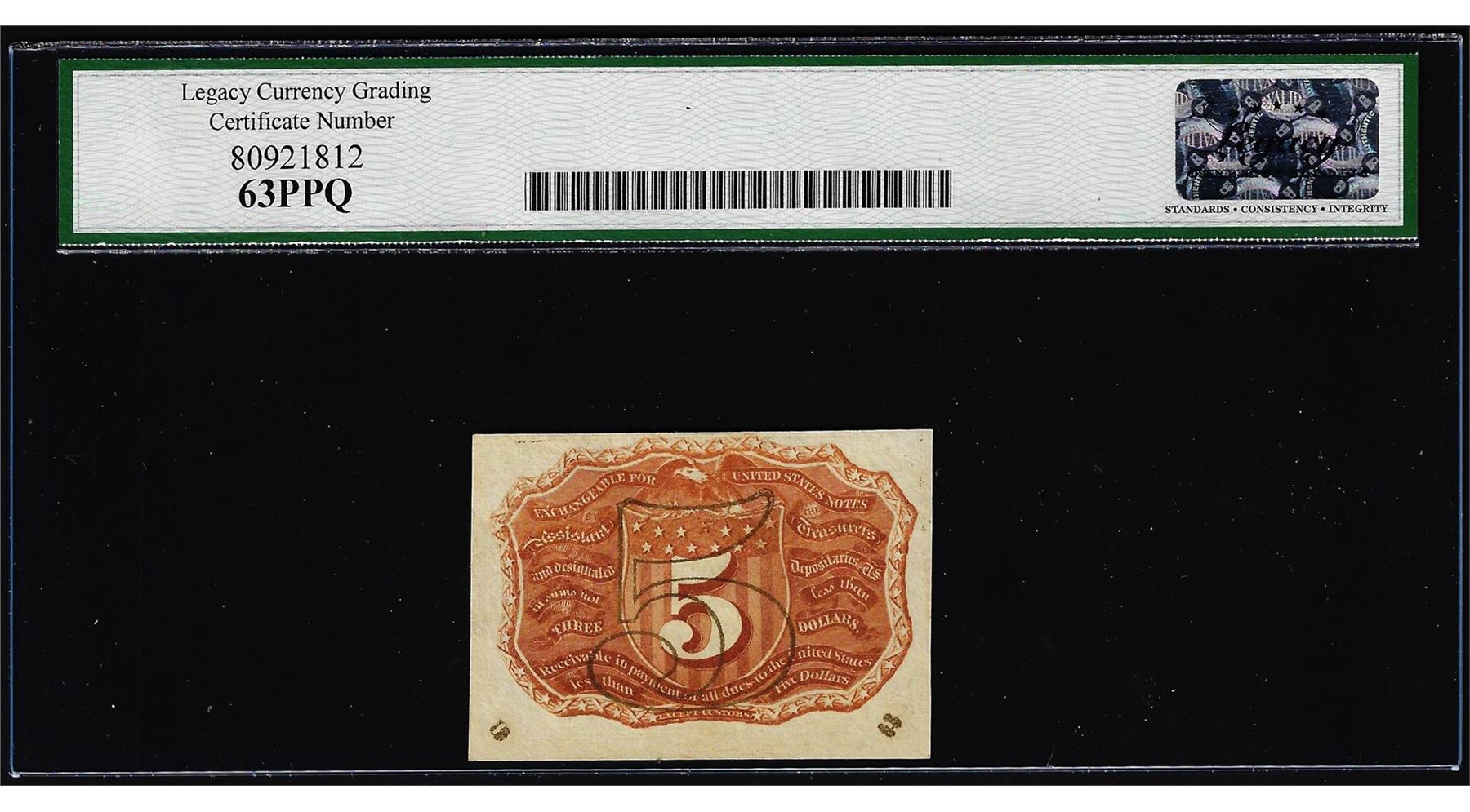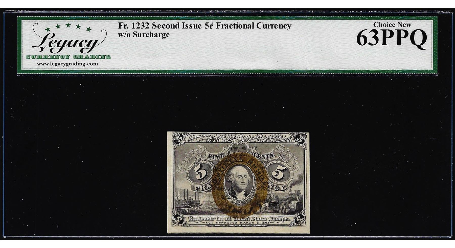 One 1863 Second Issue Five Cents Fractional Note Fr.1232 Legacy Choice New 63PPQ. Legacy Graded.
