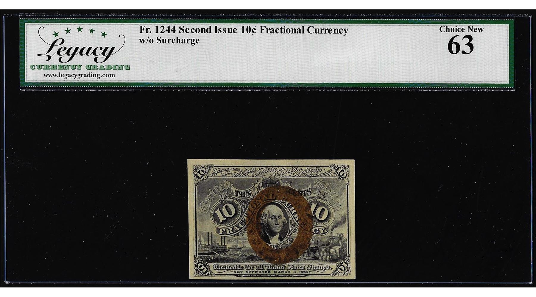 One 1863 Second Issue Ten Cents Fractional Currency Note Fr.1244 Legacy Choice New 63. Legacy Graded.