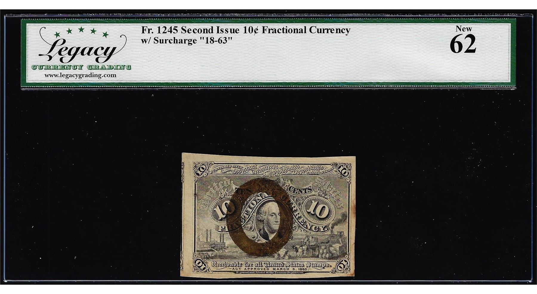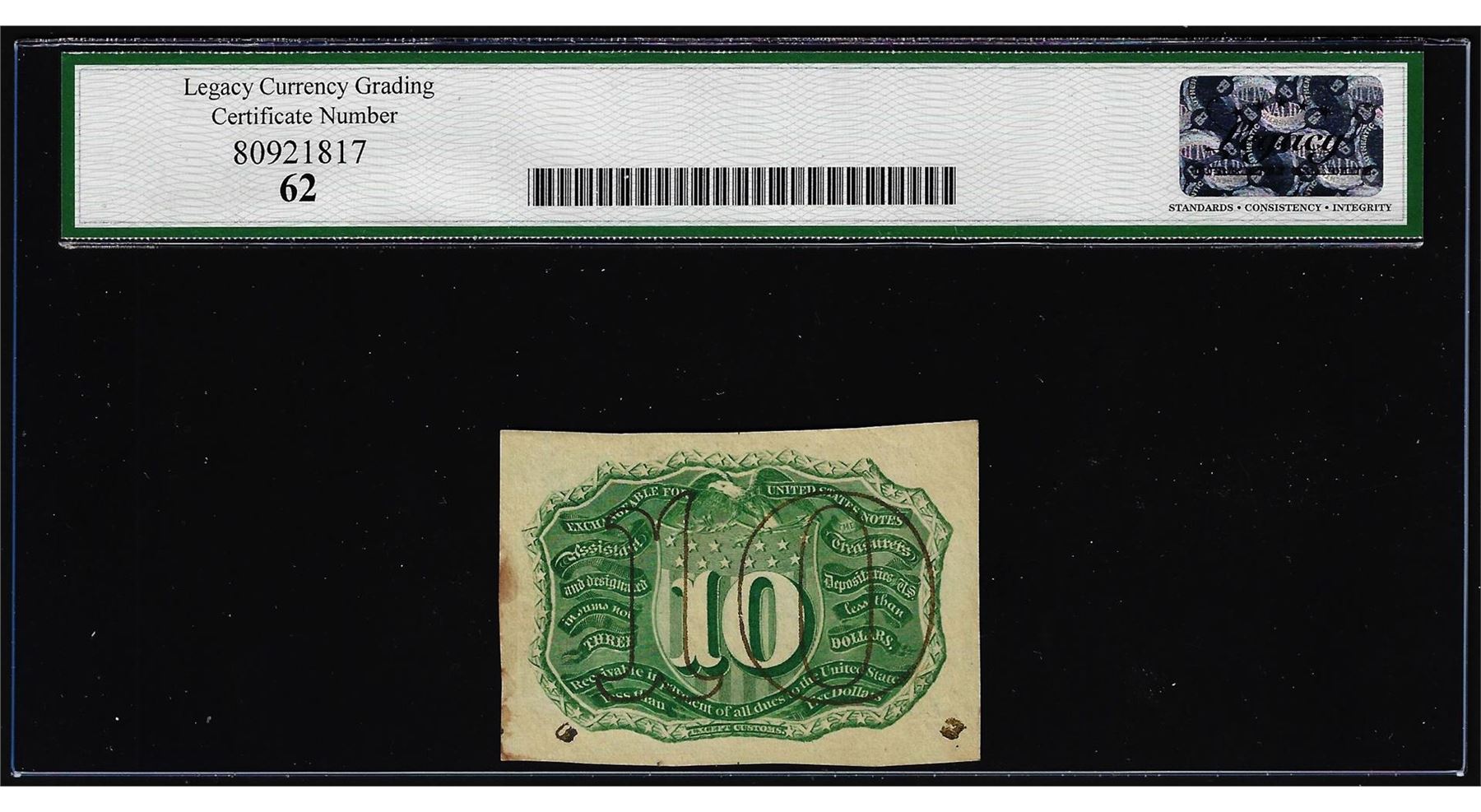 One 1863 Second Issue Ten Cents Fractional Currency Note Fr.1245 Legacy New 62. Legacy Graded.
