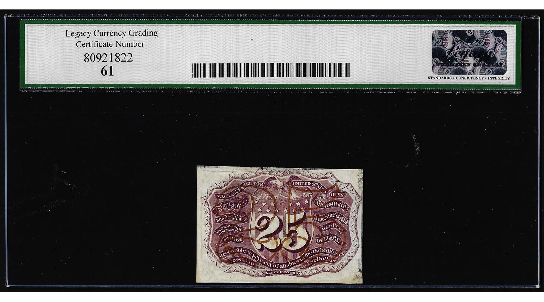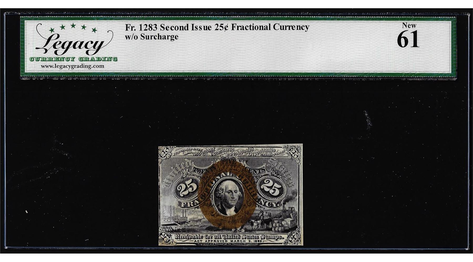 One 1863 Second Issue Ten Cents Fractional Currency Note Fr.1283 Legacy New 61. Legacy Graded.
