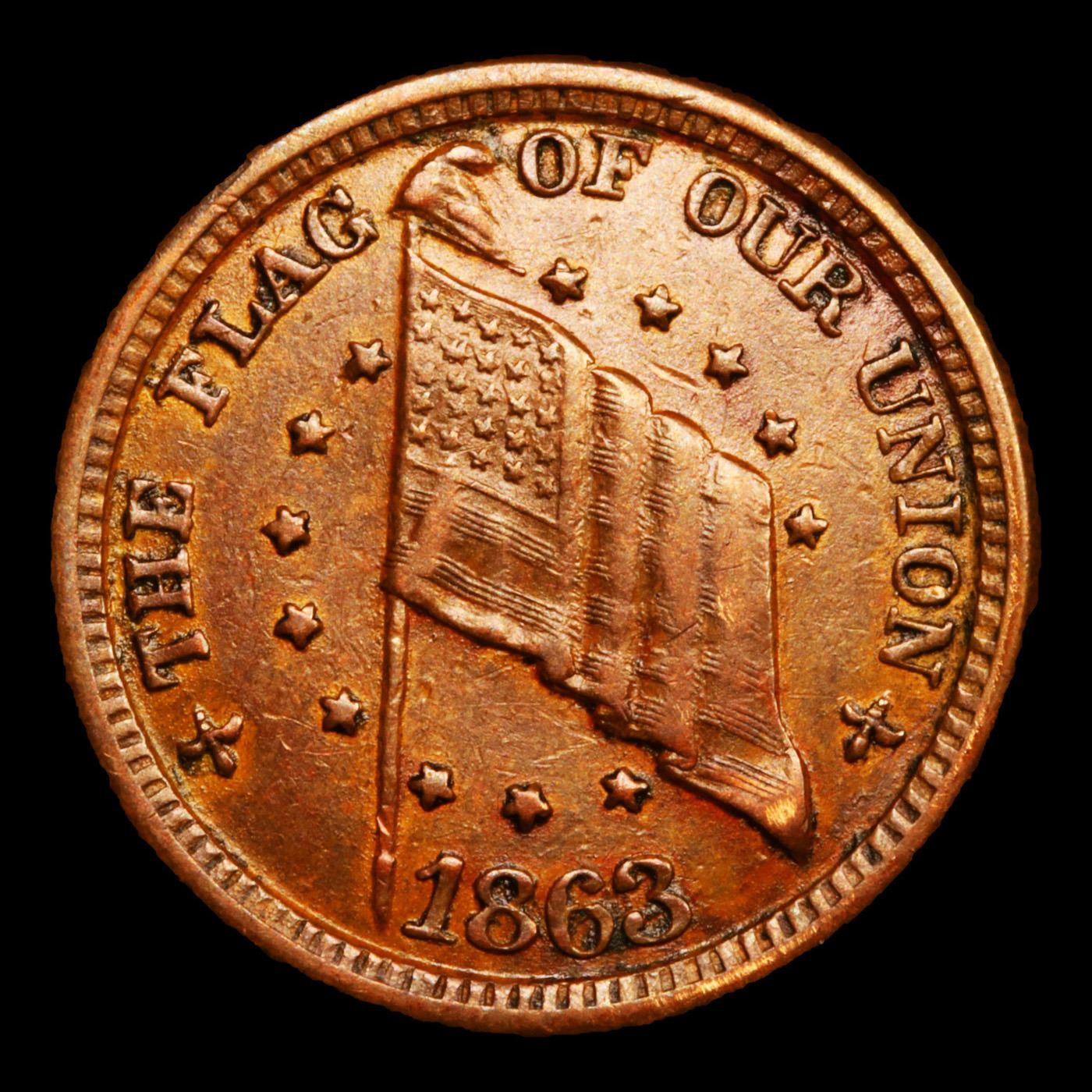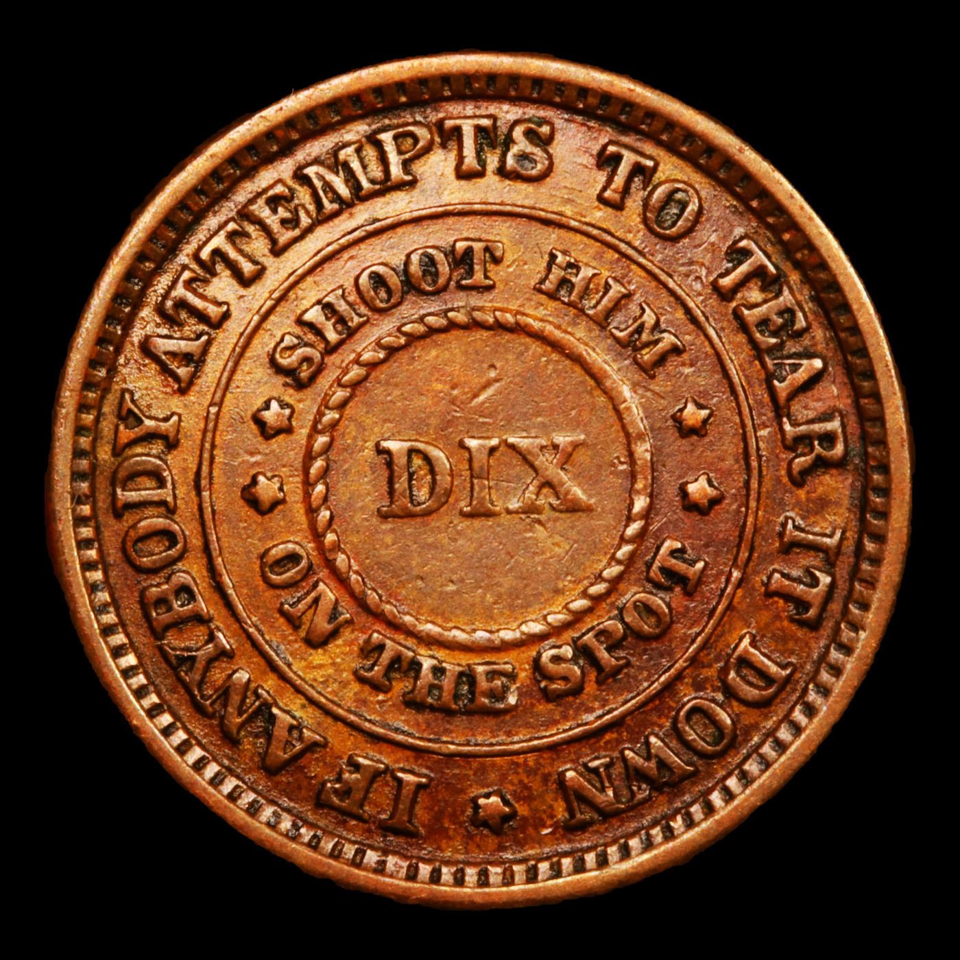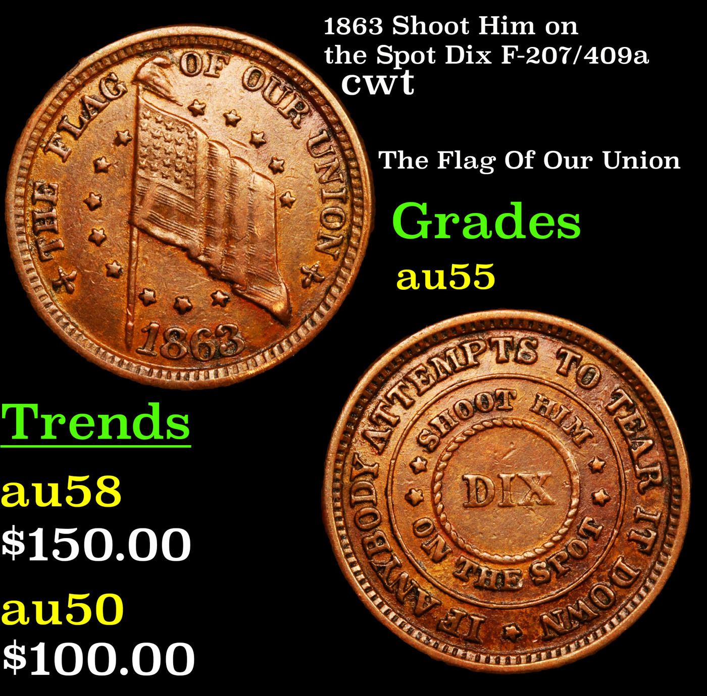 1863 Shoot Him on the Spot Dix F-207/409a Civil War Token 1c Grades Choice AU. Obverse: Shoot Him On The Spot Dix Reverse: The Flag Of Our Union