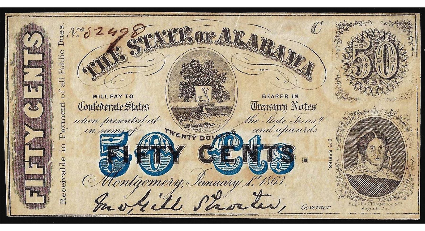 One 1863 State of Alabama Fifty Cents Obsolete Banknote.
