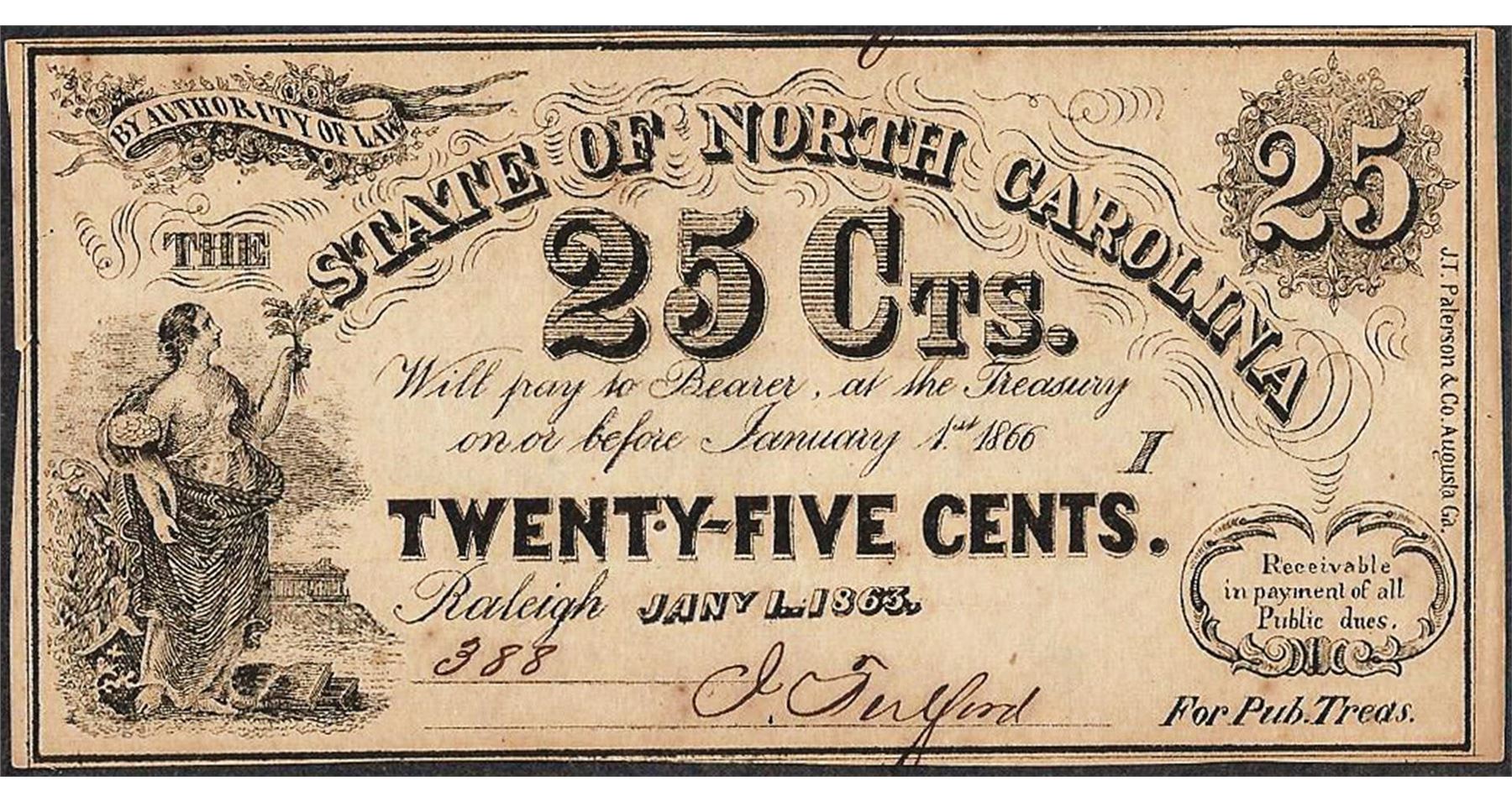 One 1863 State of North Carolina Twenty Five Cents Obsolete Note.