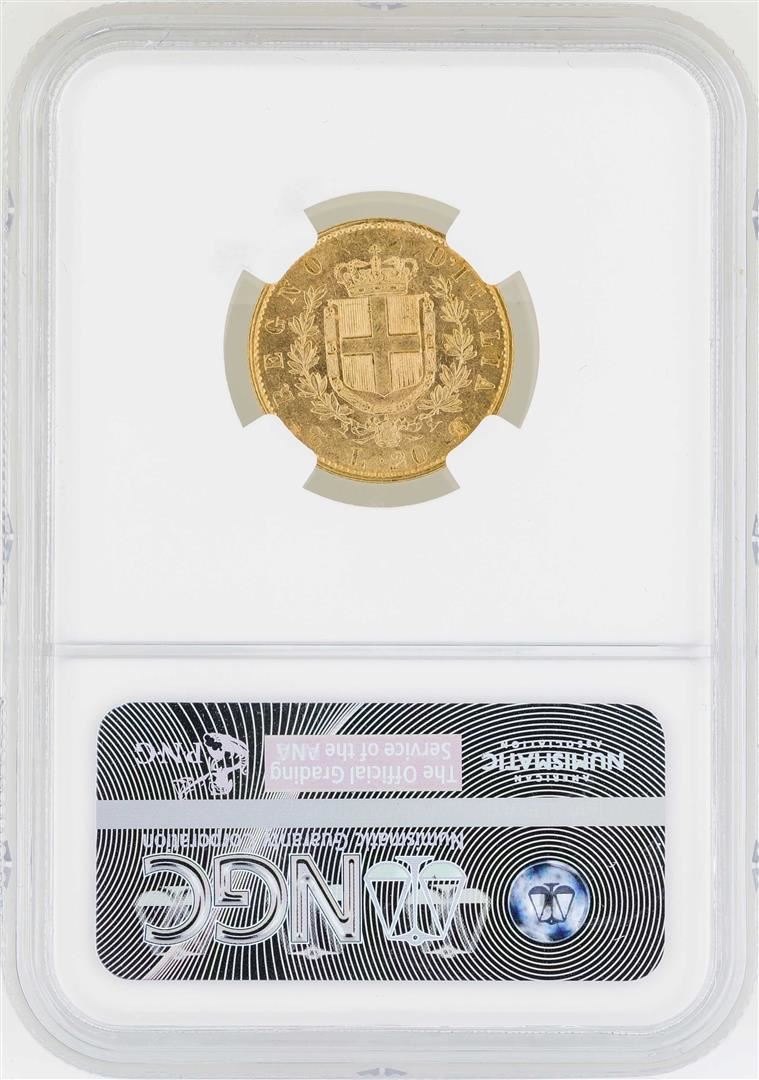 One 1863-T Italy 20 Lira BN Victor Emanuel Gold Coin NGC MS62. NGC Certified.