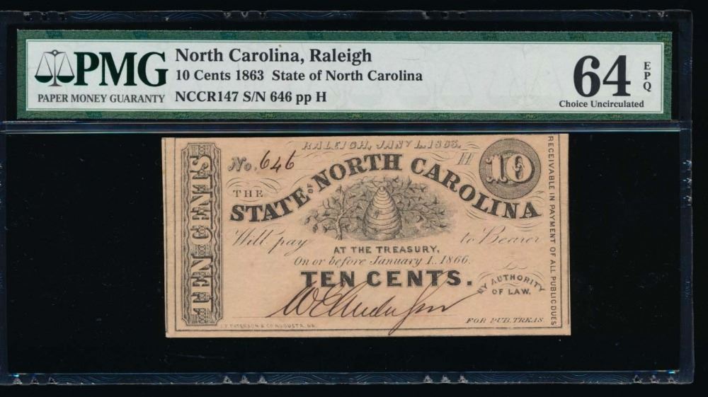 One 1863 Ten Cent Raleigh NC Obsolete Note PMG 64EPQ.