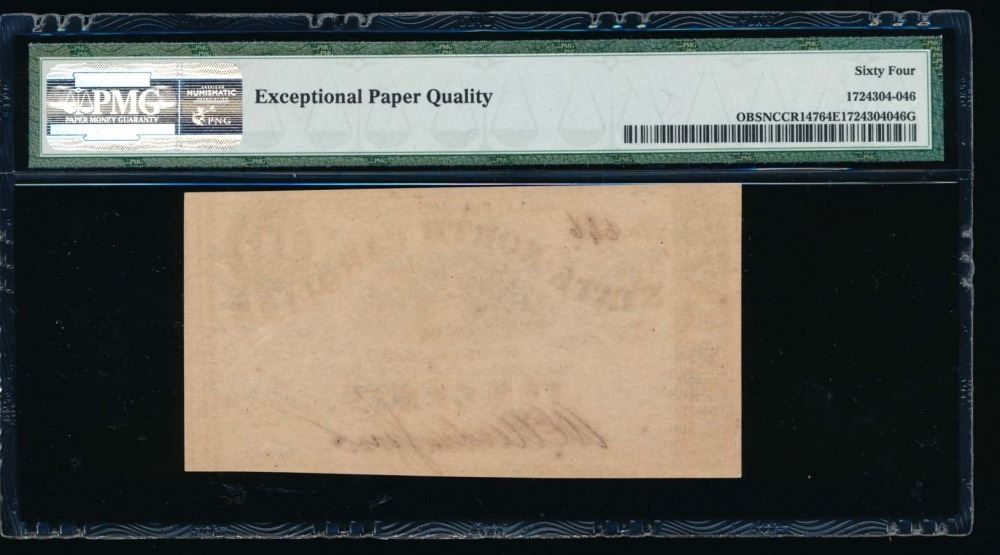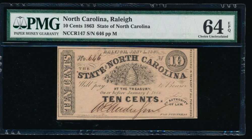 One 1863 Ten Cent Raleigh NC Obsolete Note PMG 64EPQ.