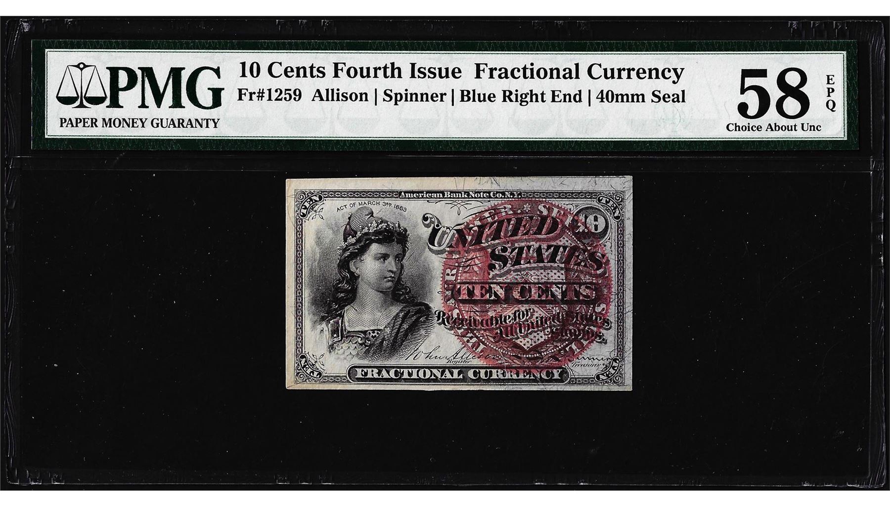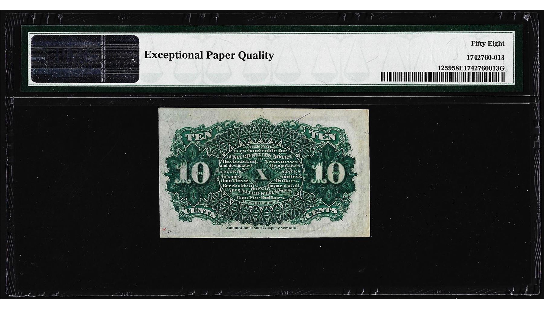 One 1863 Ten Cents Fourth Issue Fractional Note Fr.1259 PMG Choice About Unc 58EPQ. PMG Certified.