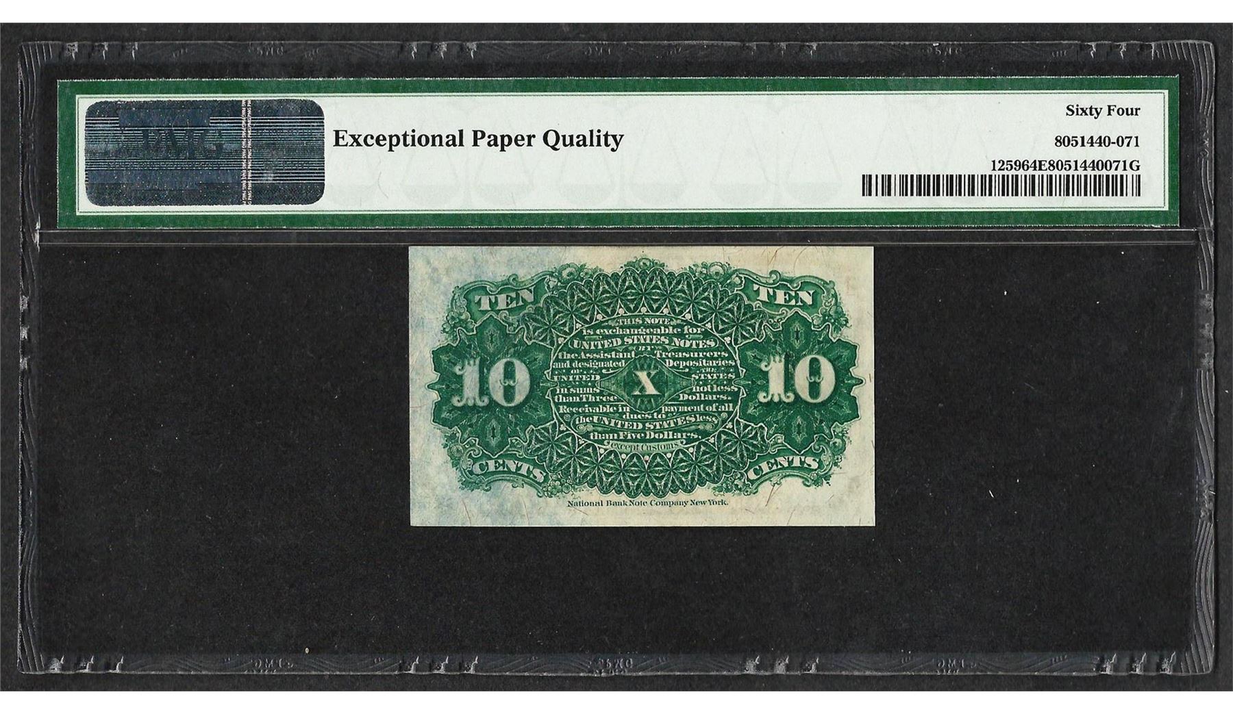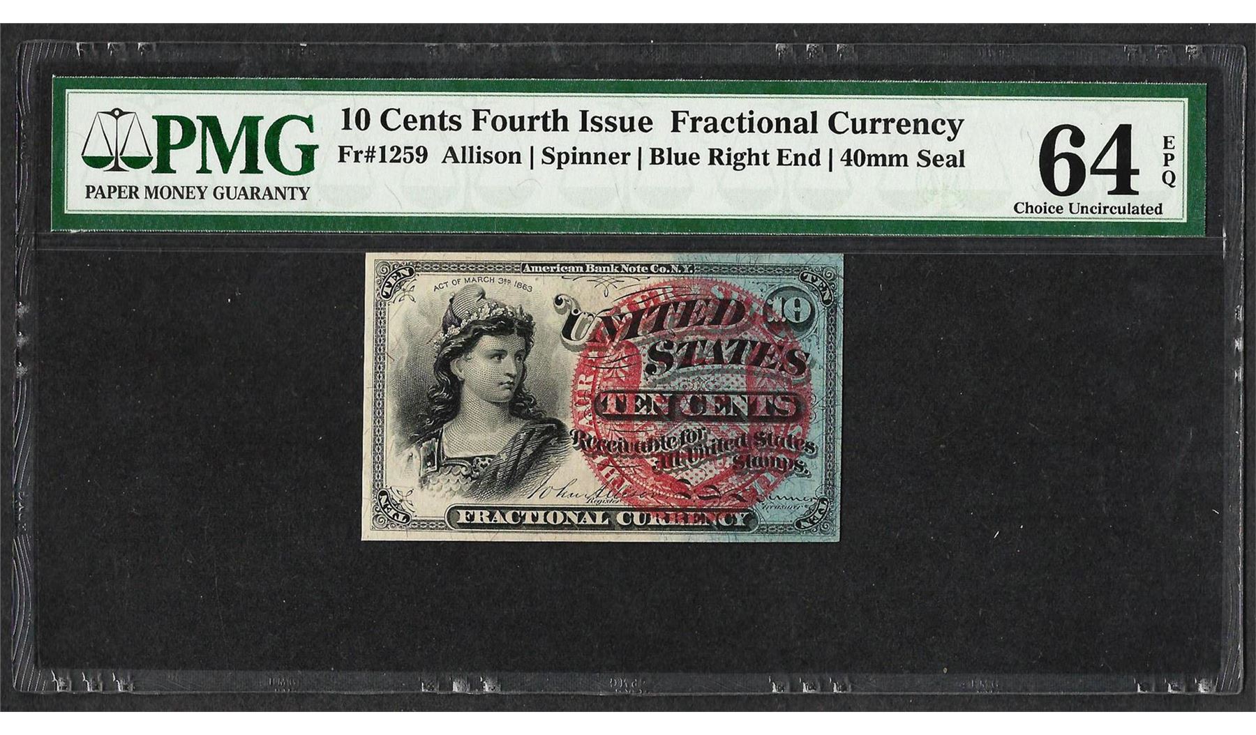 One 1863 Ten Cents Fourth Issue Fractional Note Fr.1259 PMG Choice Uncirculated 64EPQ. PMG Certified.