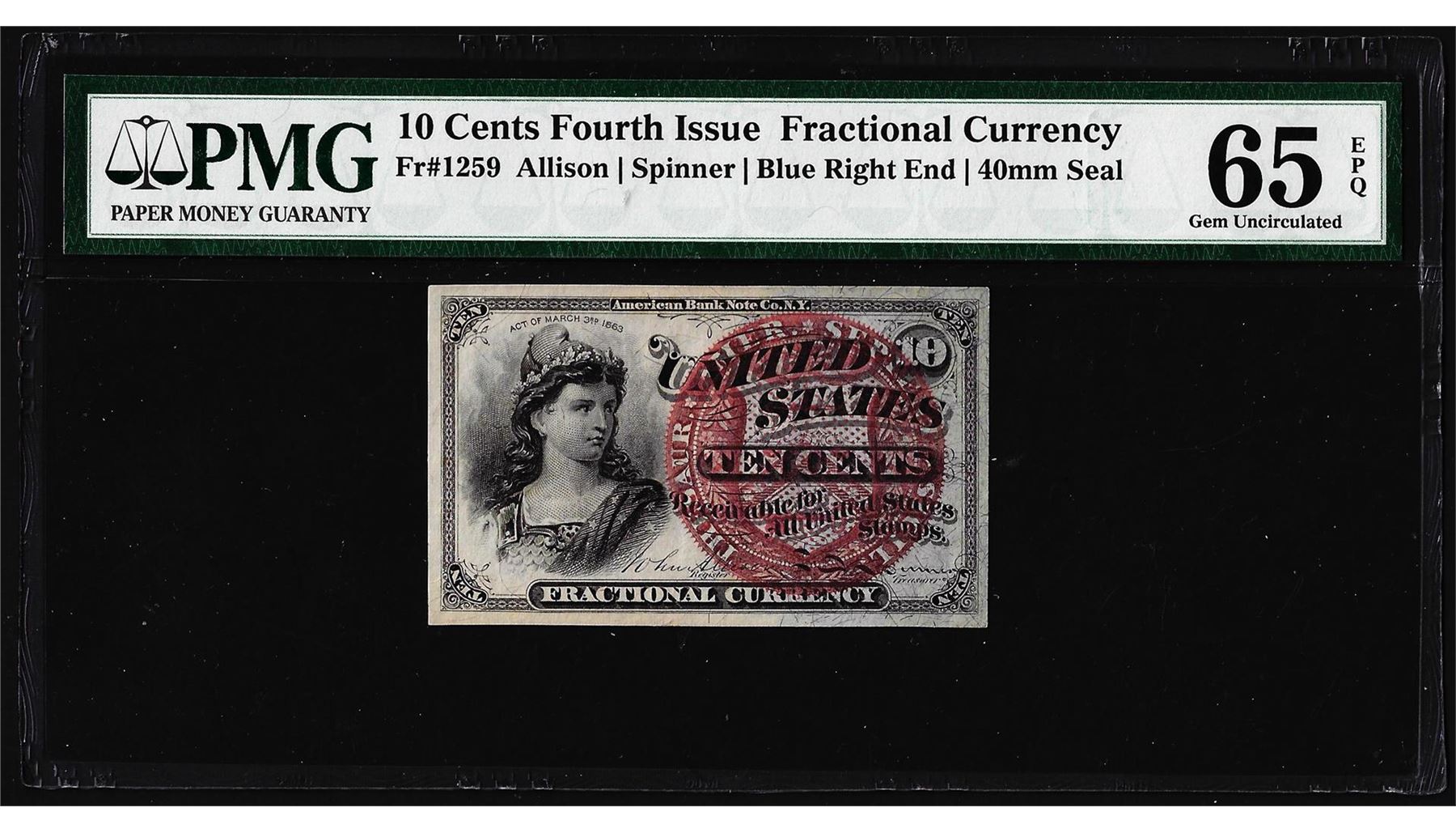 One 1863 Ten Cents Fourth Issue Fractional Note Fr.1259 PMG Gem Uncirculated 65EPQ. PMG Certified.