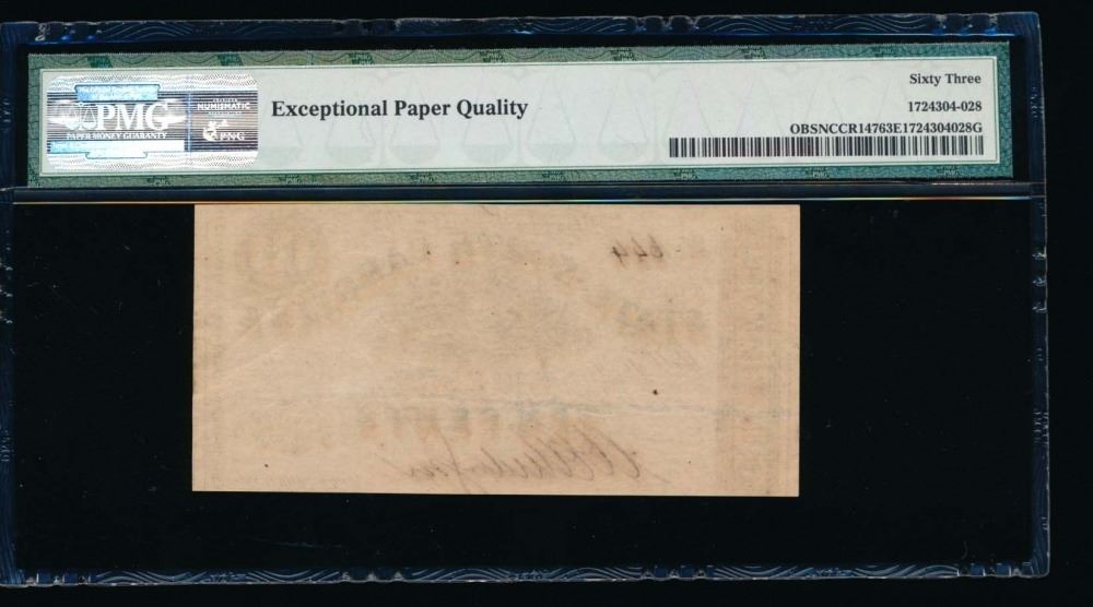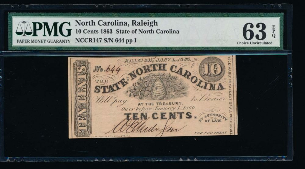 One 1863 Ten Cents North Carolina Obsolete Note PMG 63EPQ.