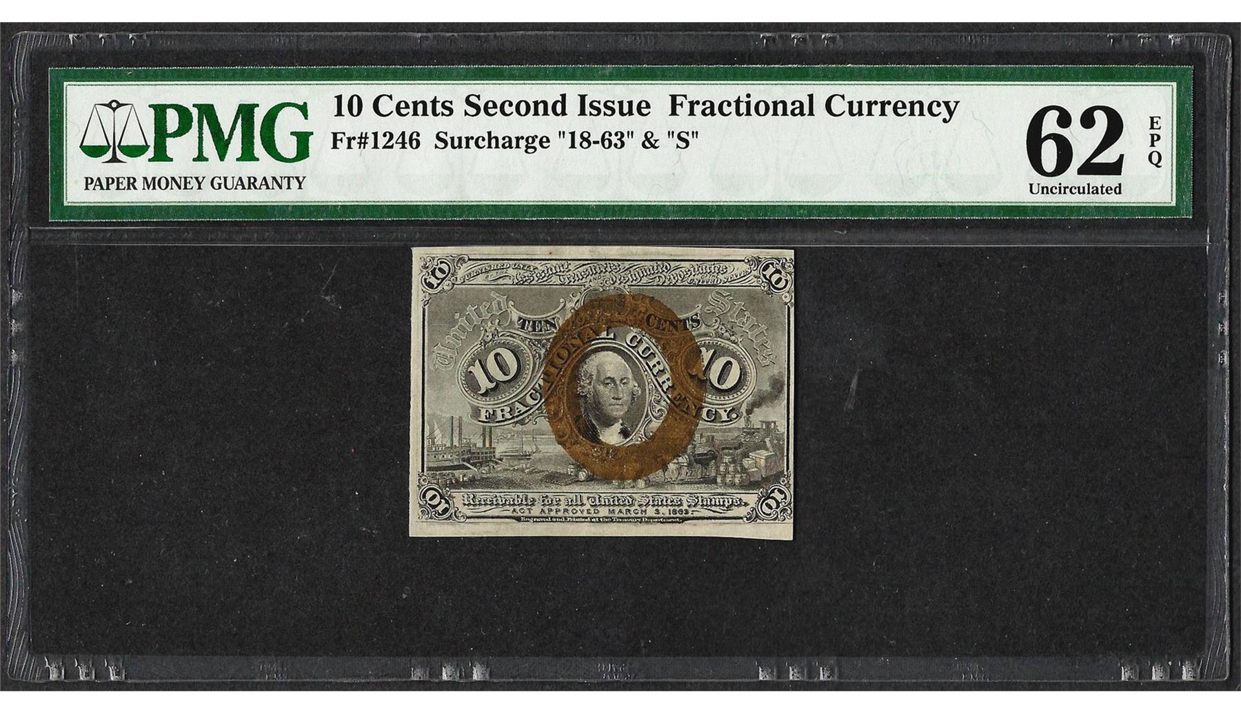 One 1863 Ten Cents Second Issue Fractional Note Fr.1246 PMG Uncirculated 62EPQ. PMG Certified.