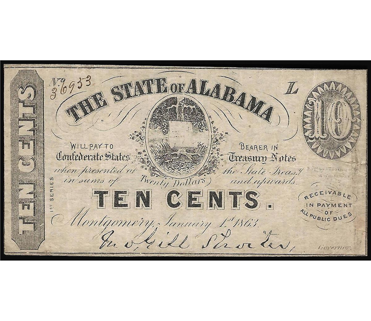 One 1863 Ten Cents The State of Alabama Obsolete Note.