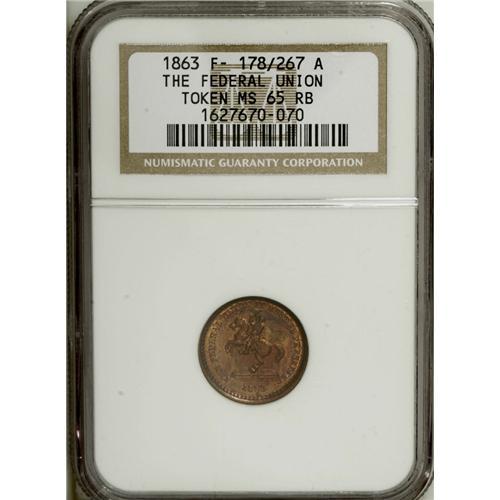 <B>1863 The Federal Union, Fuld 178/267A, R.1, MS65 Red and Brown NGC.</B></I> Copper. Nice example with what appears to be a statue of Washington on the obverse riding a horse. While the rarity rating is only R.1, the condition is not. Viewing is recommended on this one.<BR><BR><b>Shipping:</b> Coin/Currency (<a target="_blank" href="http://www.heritageauctions.com/common/shipping.php">view shipping information</a>)