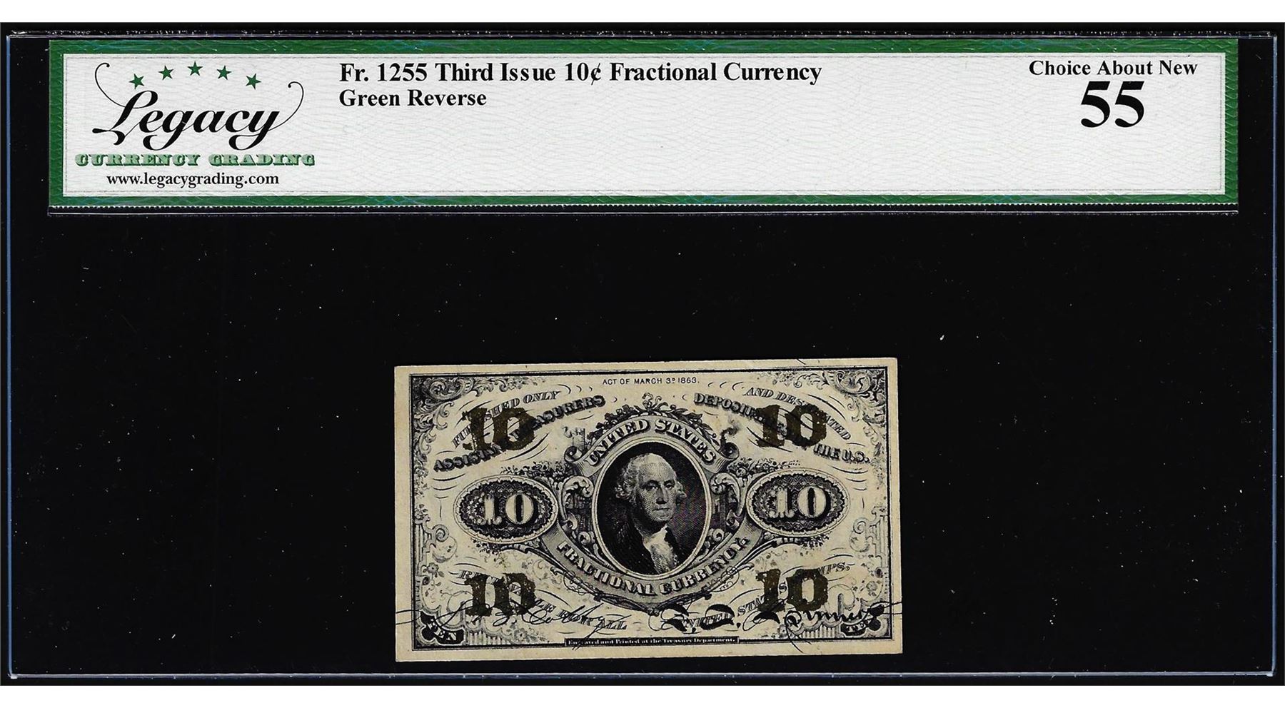 One 1863 Third Issue 10 Cents Fractional Currency Note Fr.1255 Legacy Choice About New 55. Legacy Graded.