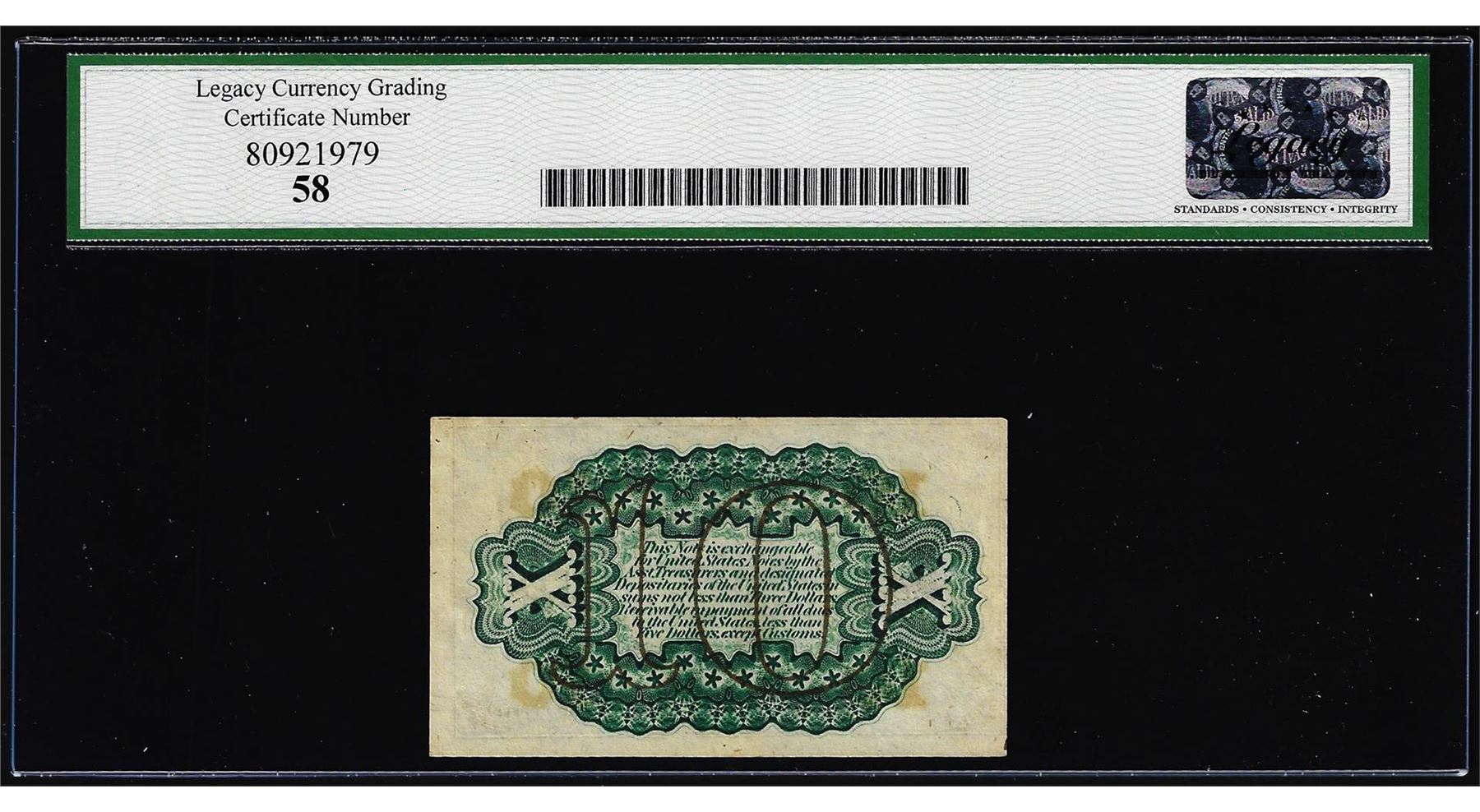 One 1863 Third Issue 10 Cents Fractional Currency Note Fr.1255 Legacy Choice About New 58. Legacy Graded.