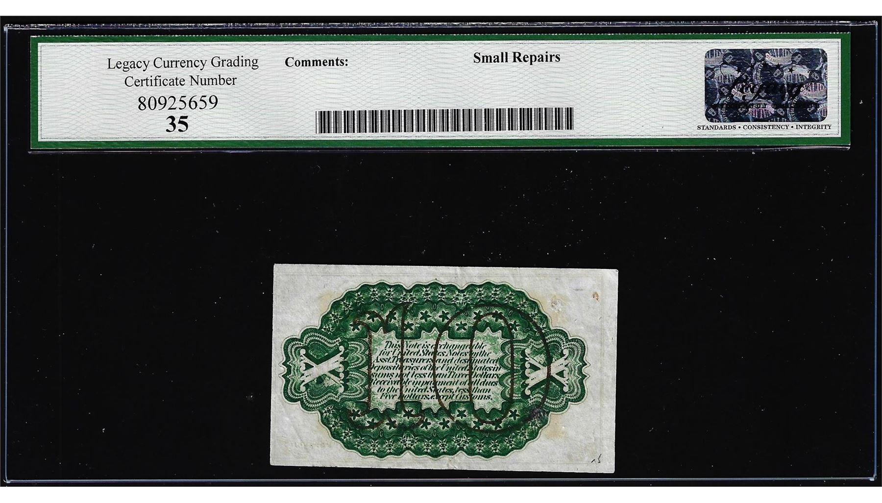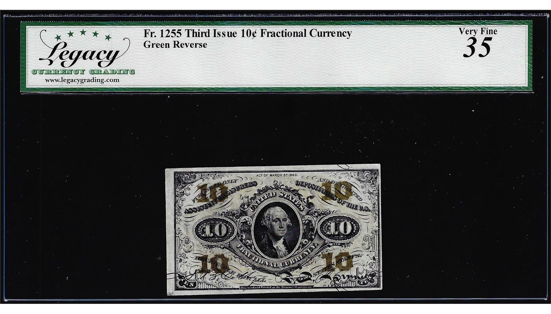 One 1863 Third Issue 10 Cents Fractional Currency Note Fr.1255 Legacy Very Fine 35. Legacy Graded.