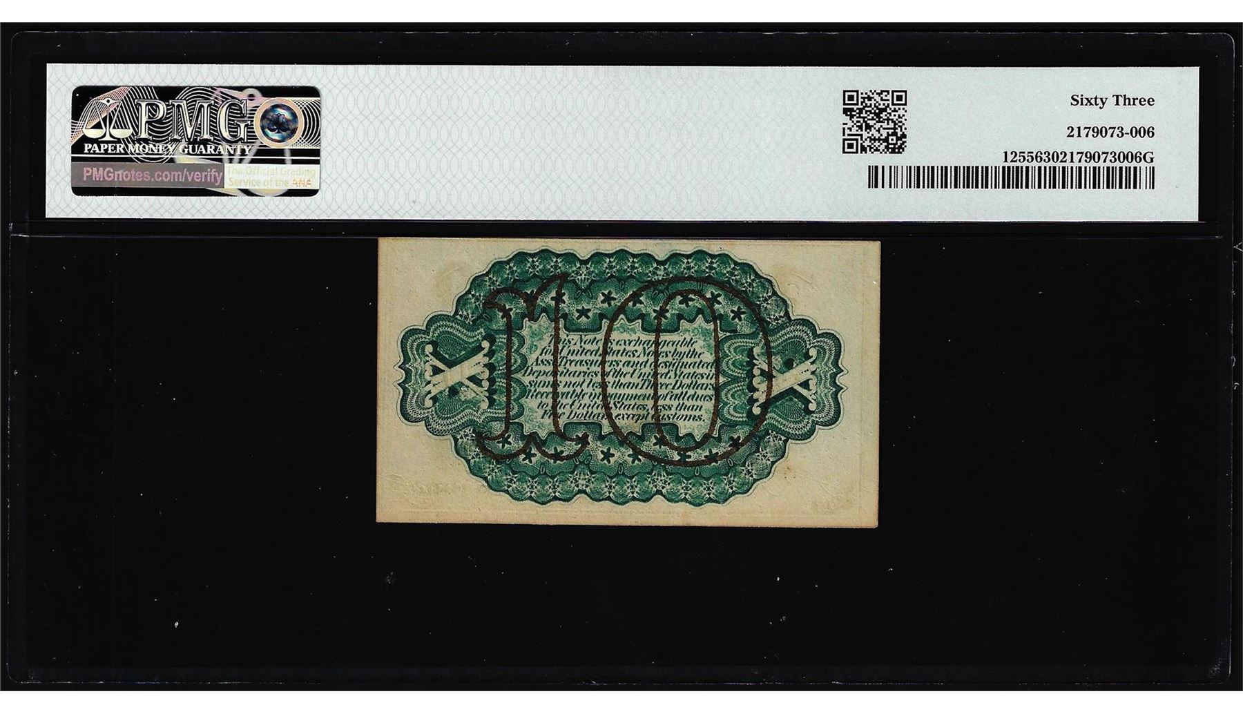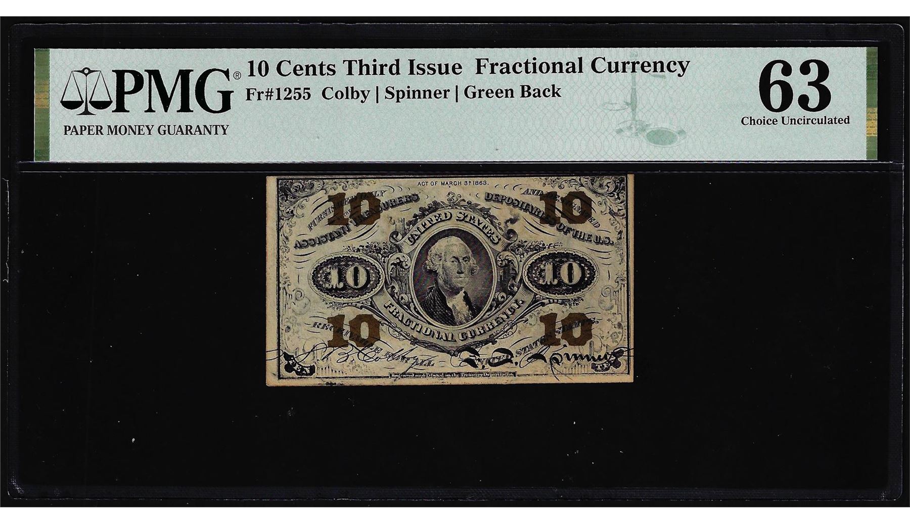 One 1863 Third Issue 10 Cents Fractional Currency Note Fr.1255PMG Choice Uncirculated 63. PMG Certified.