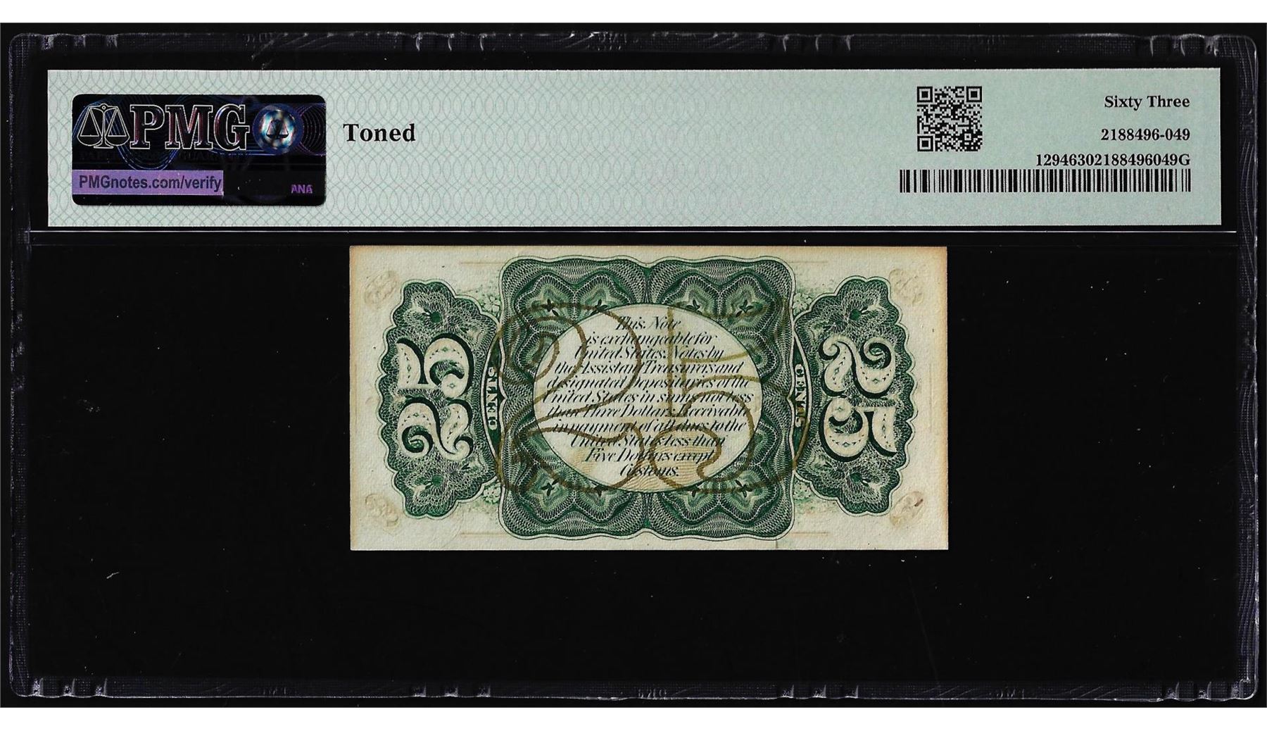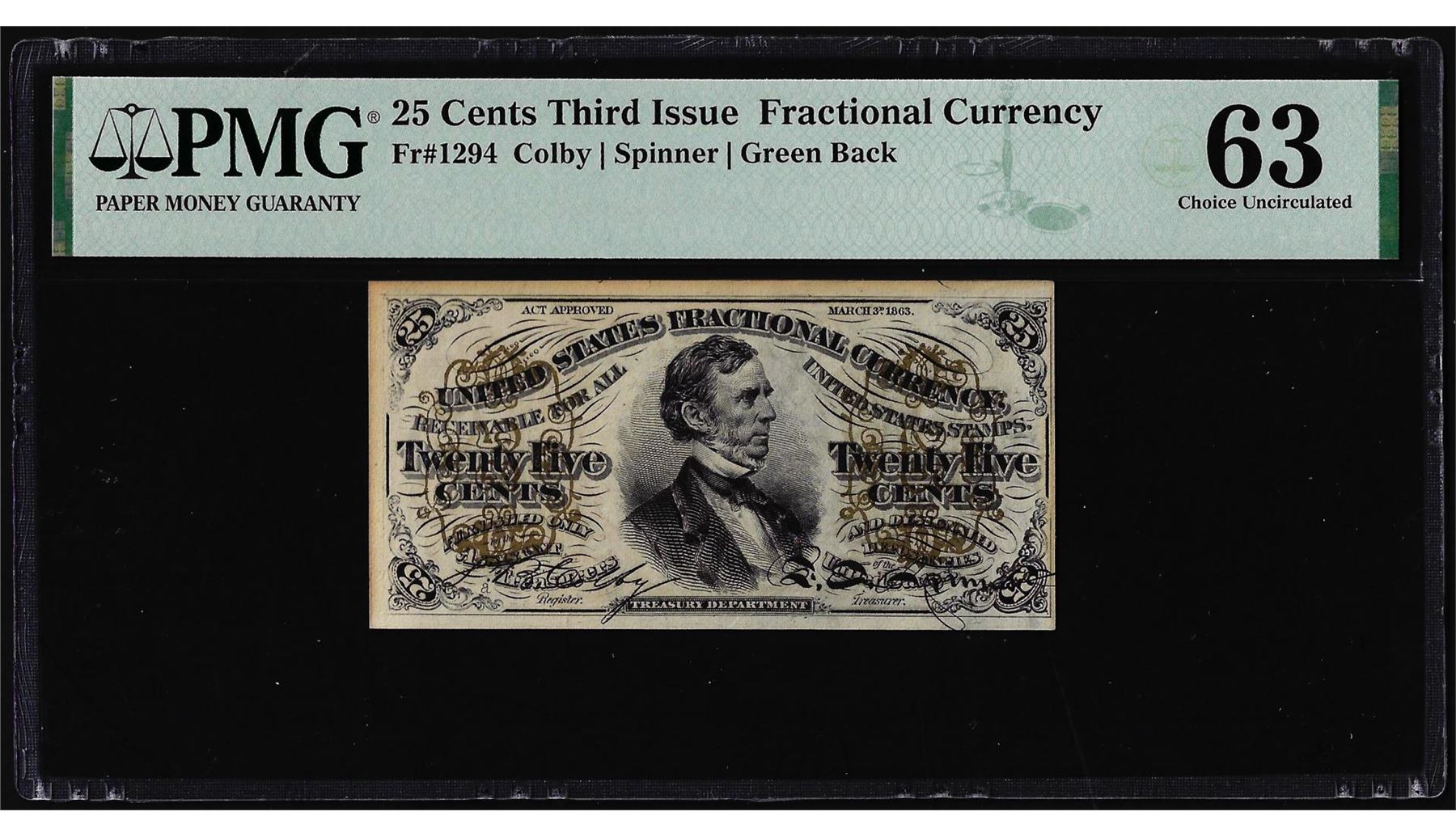 One 1863 Third Issue 25 Cent Fractional Currency Note Fr.1294 PMG Choice Uncirculated 63. PMG Certified.