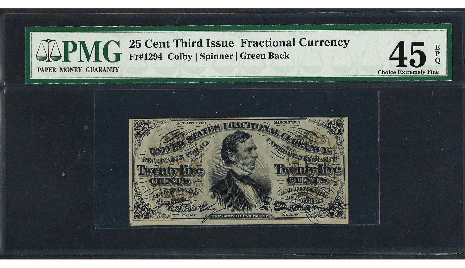 One 1863 Third Issue 25 Cent Fractional Currency Note PMG Choice Extremely Fine 45EPQ. PMG Certified.