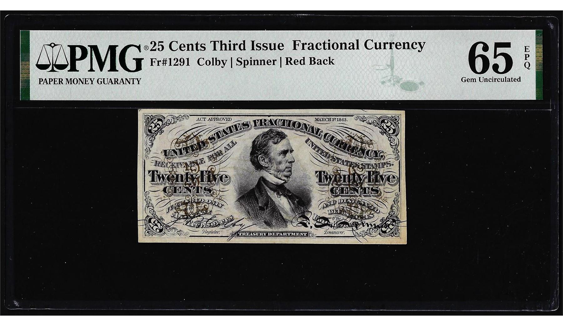 One 1863 Third Issue 25 Cents Fractional Currency Note Fr.1291 PMG Gem Uncirculated 65EPQ. PMG Certified.