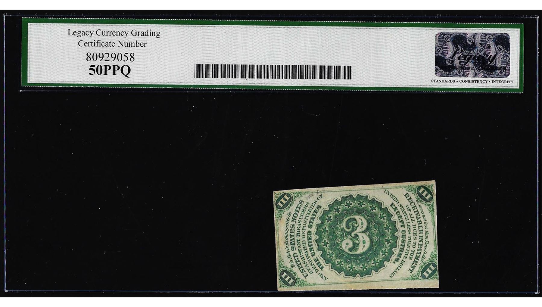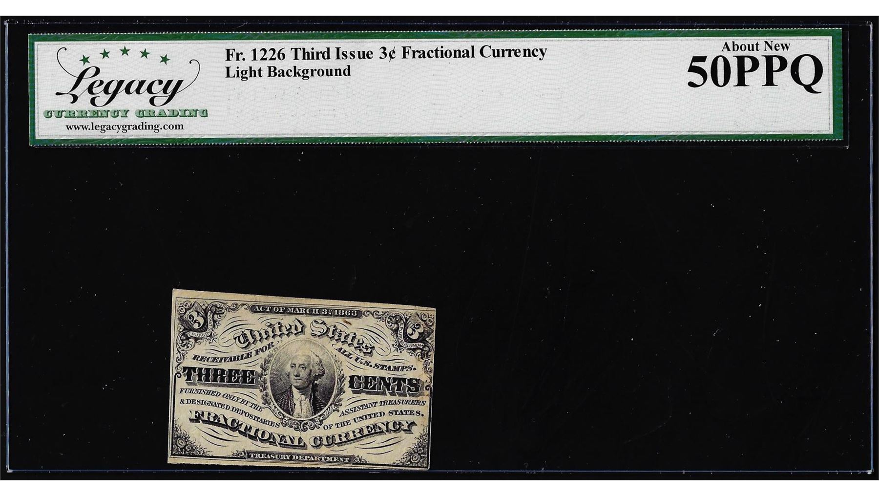 One 1863 Third Issue 3 Cents Fractional Currency Note Fr.1226 Legacy About New 50PPQ. Legacy Graded.