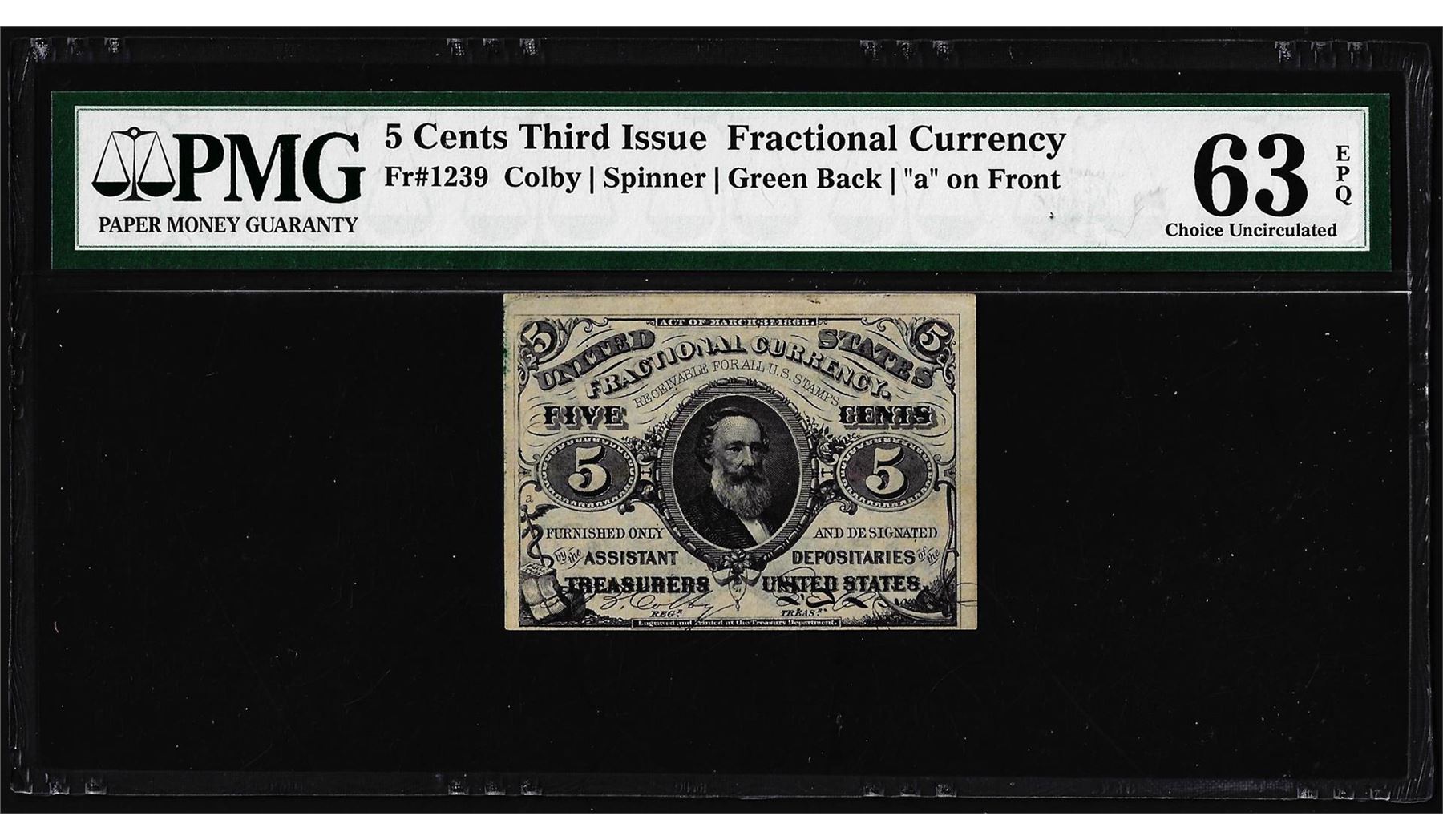 One 1863 Third Issue 5 Cents Fractional Currency Note Fr.1239 PMG Ch. Uncirculated 63EPQ. PMG Certified.