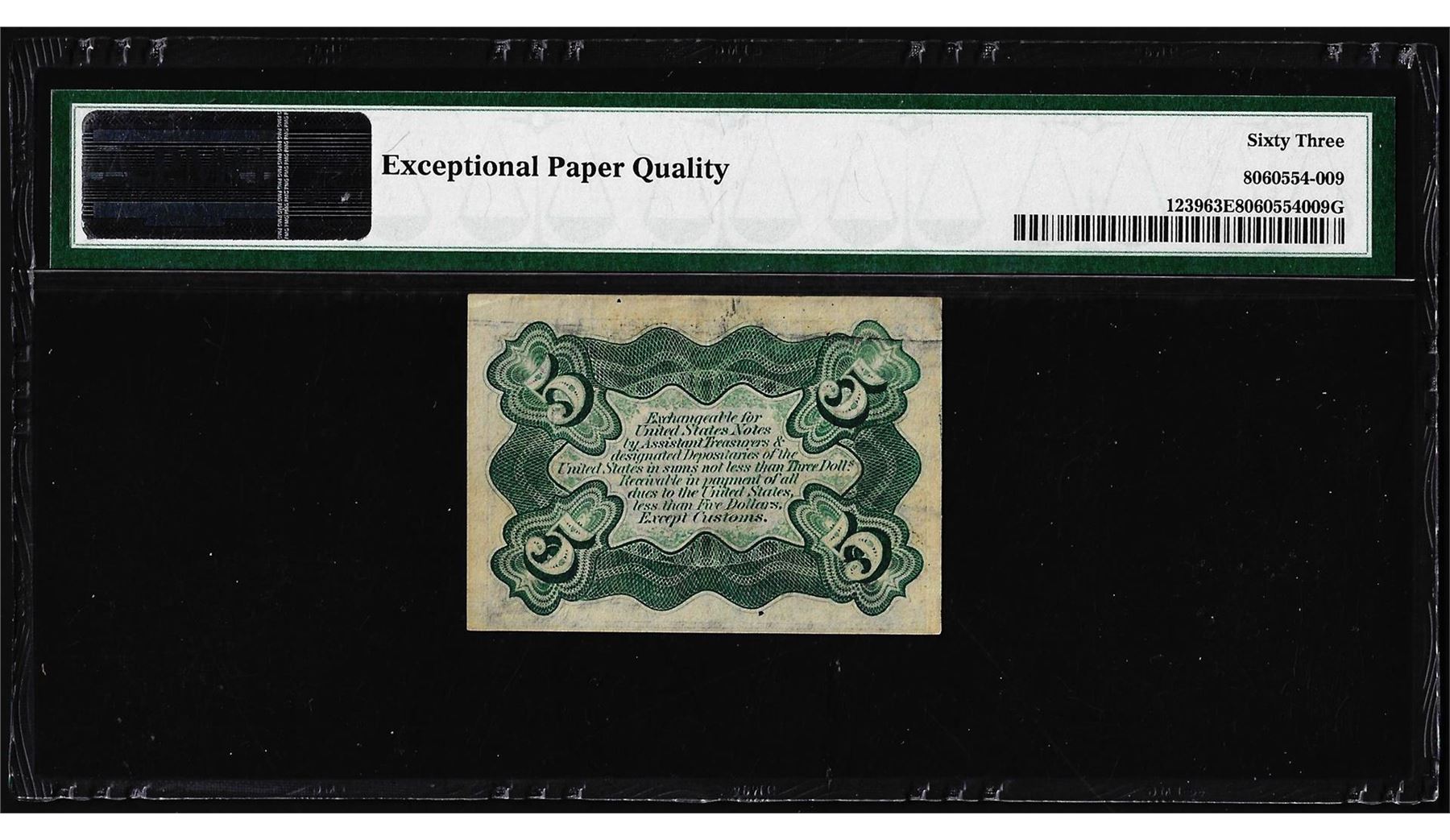 One 1863 Third Issue 5 Cents Fractional Currency Note Fr.1239 PMG Ch. Uncirculated 63EPQ. PMG Certified.