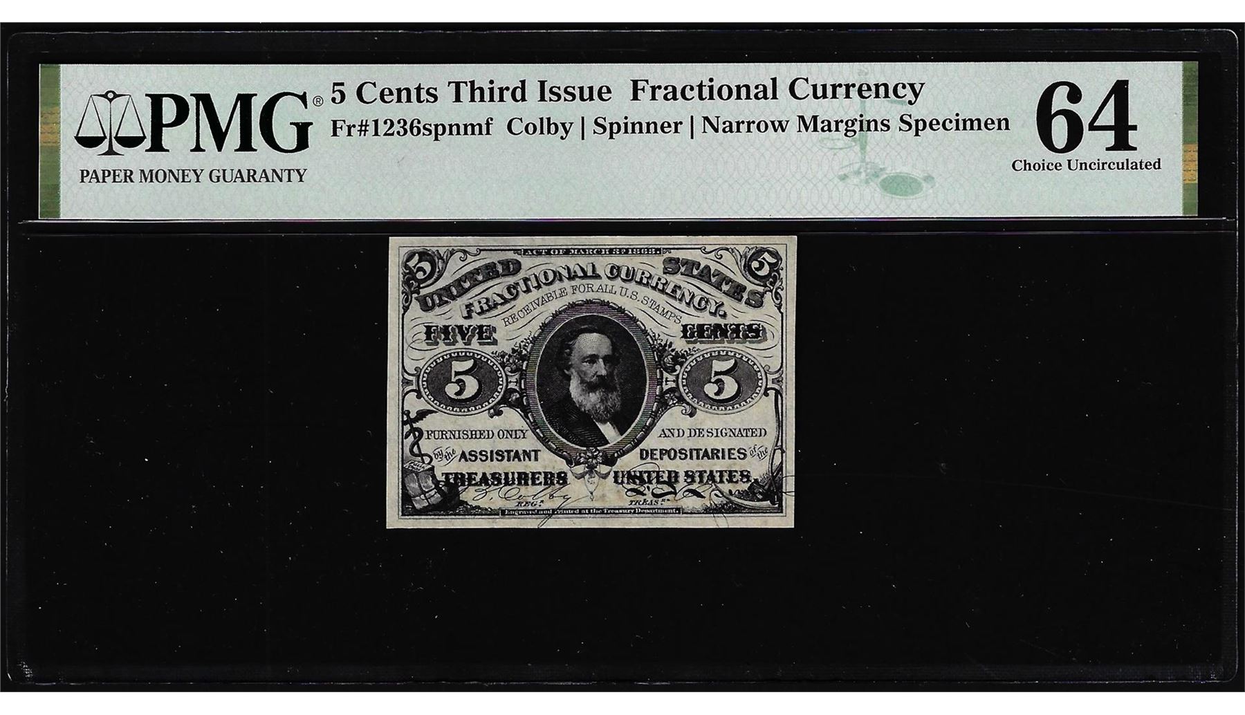 One 1863 Third Issue 5 Cents Specimen Fractional Note Fr.1236spnmf PMG Ch. Uncirculated 64. PMG Certified.