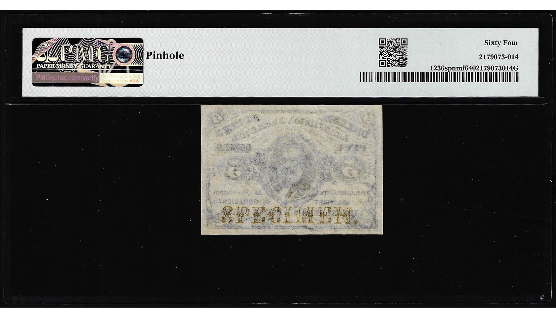 One 1863 Third Issue 5 Cents Specimen Fractional Note Fr.1236spnmf PMG Ch. Uncirculated 64. PMG Certified.