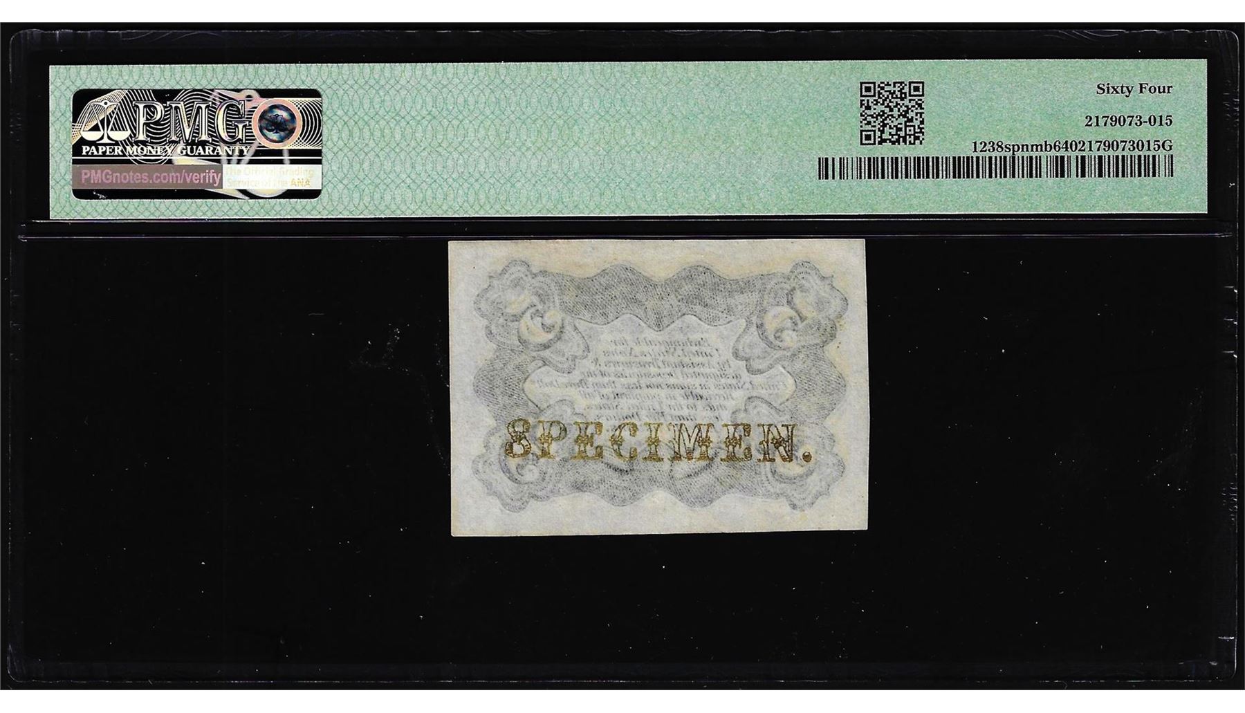 One 1863 Third Issue 5 Cents Specimen Fractional Note Fr.1238spnmf PMG Ch. Uncirculated 64. PMG Certified.