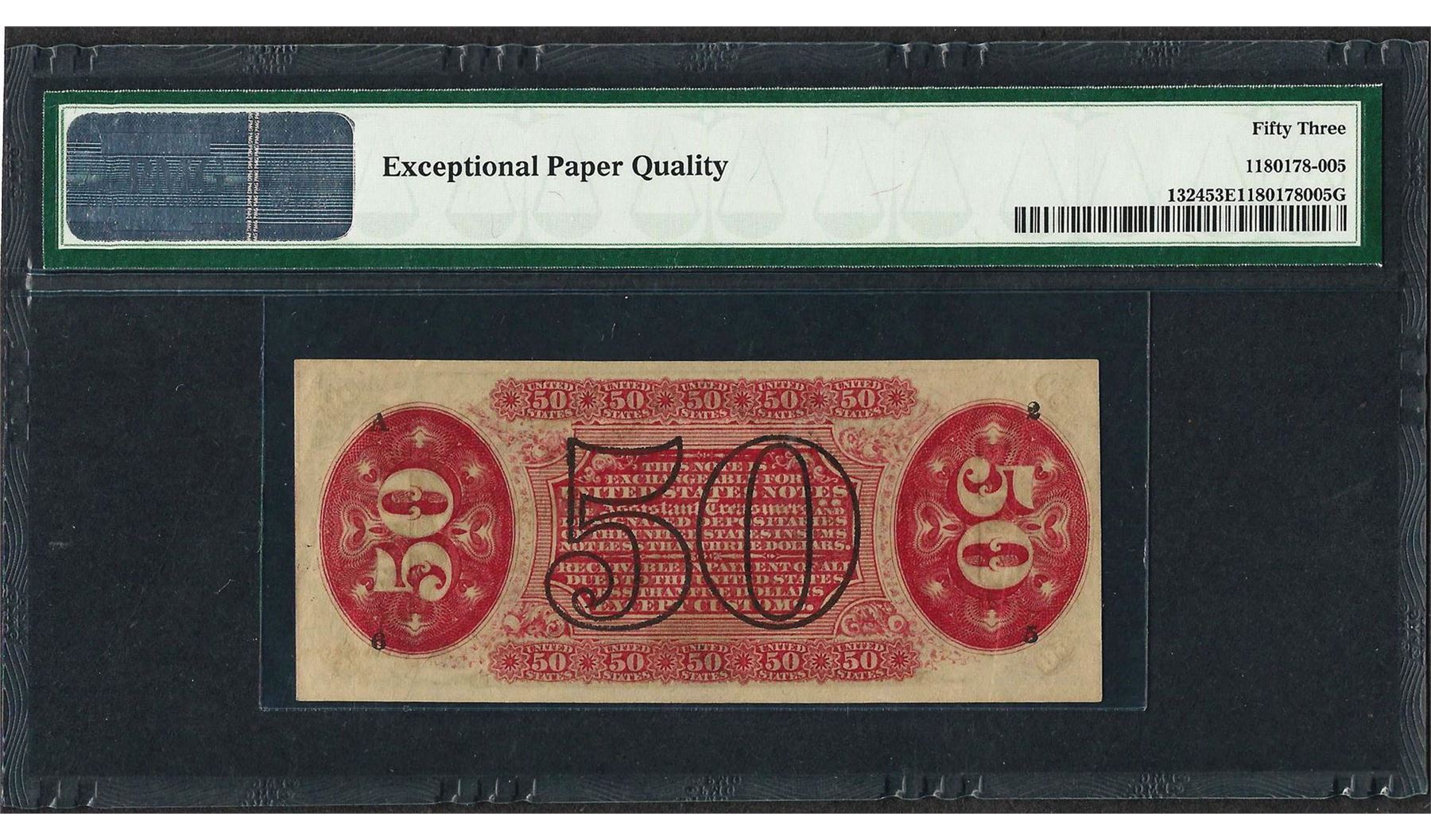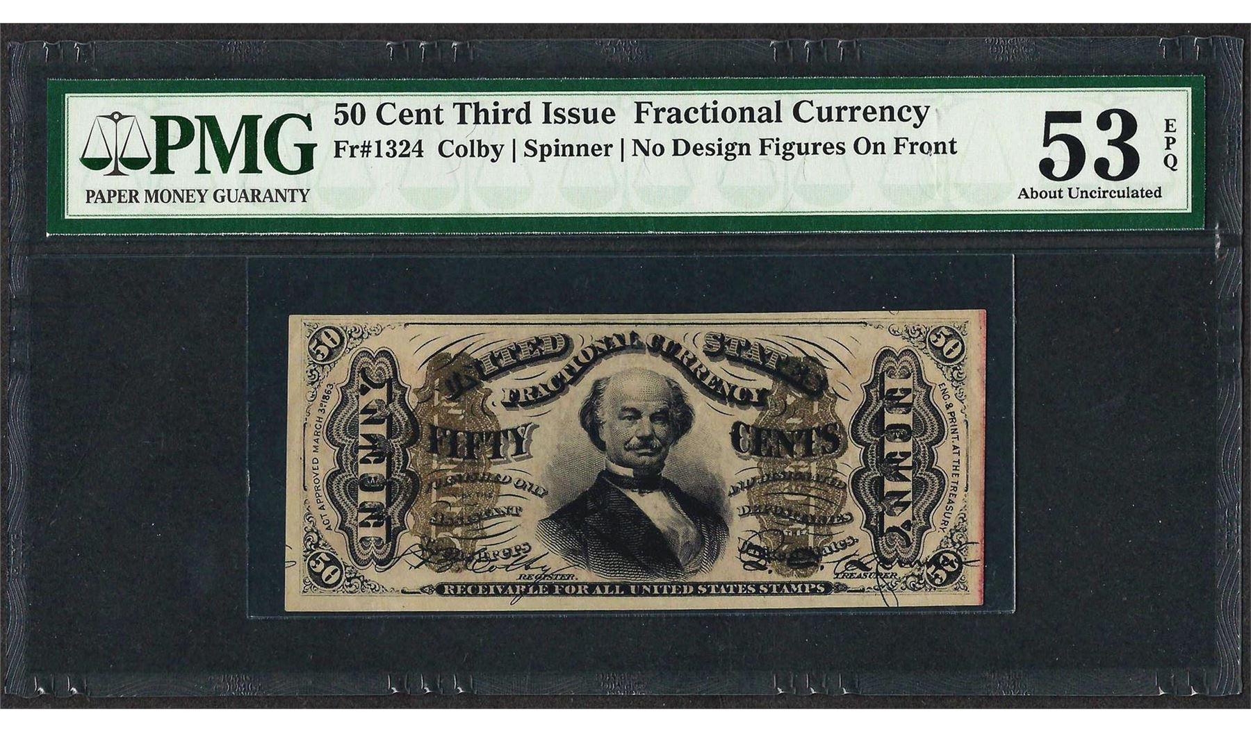 One 1863 Third Issue 50 Cent Fractional Currency Note PMG About Uncirculated 53EPQ. PMG Certified.