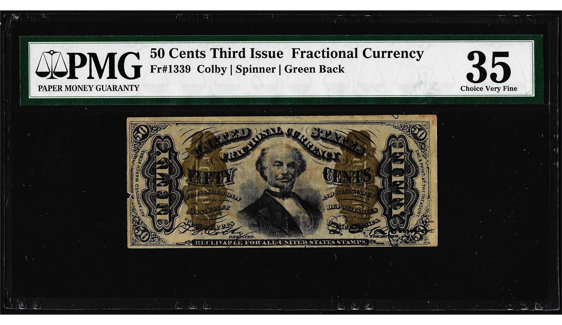 One 1863 Third Issue 50 Cents Fractional Currency Note Fr.1339 PMG Choice Very Fine 35. PMG Certified.