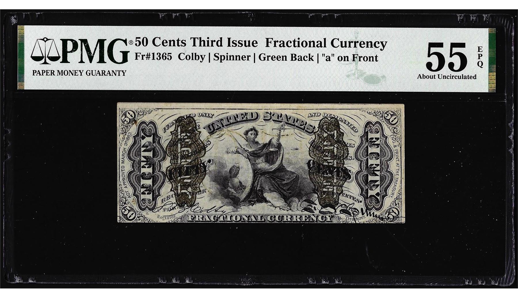 One 1863 Third Issue 50 Cents Fractional Currency Note Fr.1365 PMG About Unc. 55EPQ. PMG Certified.